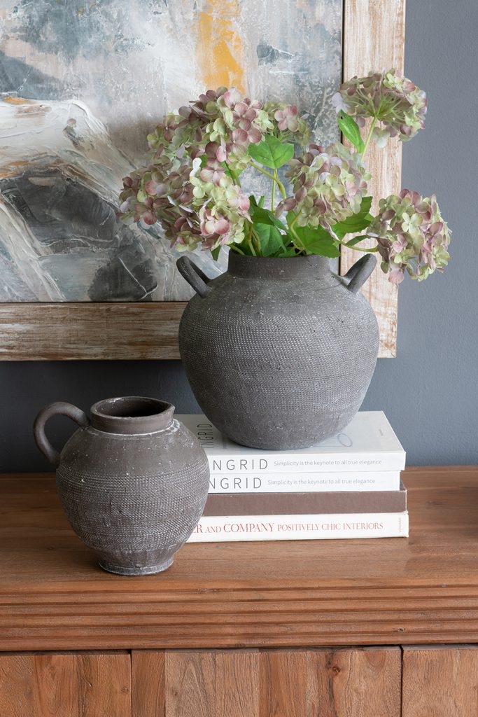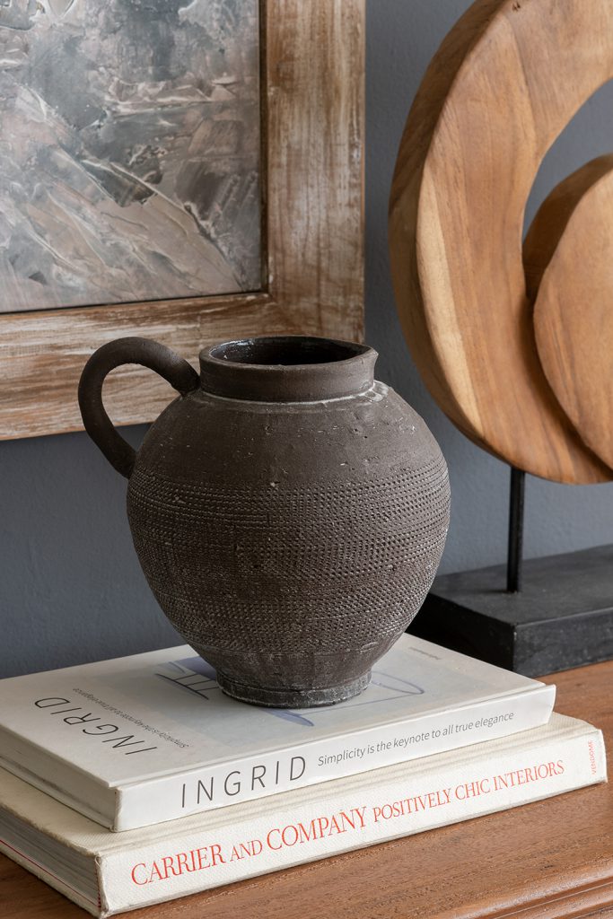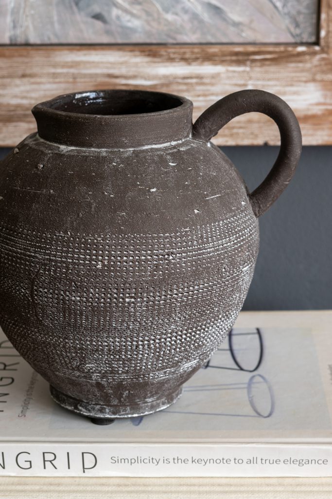 Inspired by classic Mediterranean pottery, this decorative jug features a round silhouette, a textured black finish, and a short looping handle. Handcrafted from high-quality ceramic, it offers lasting beauty that will elevate any kitchen, dining room, bedroom, or office whether displayed alone or paired with faux flowers.