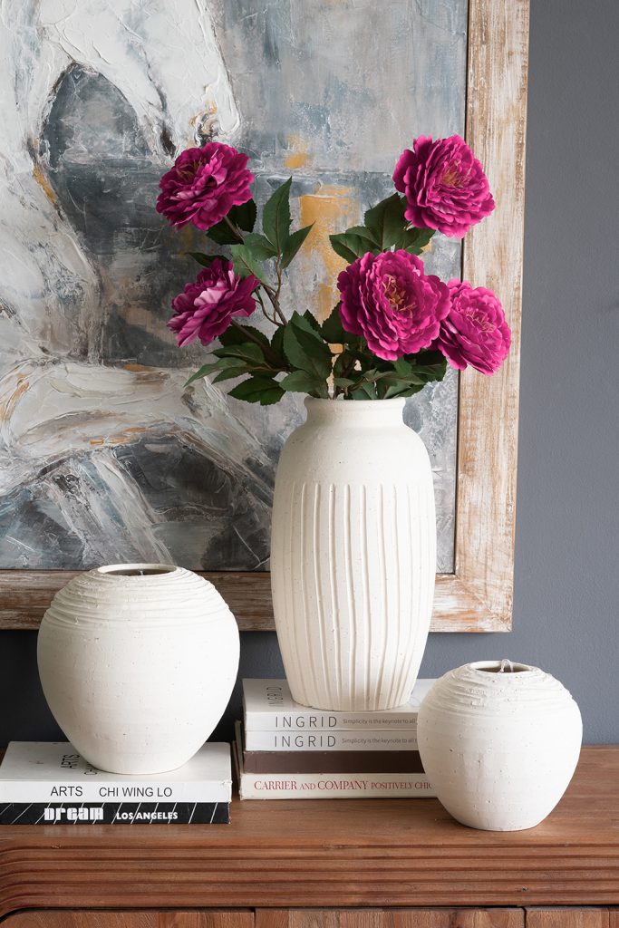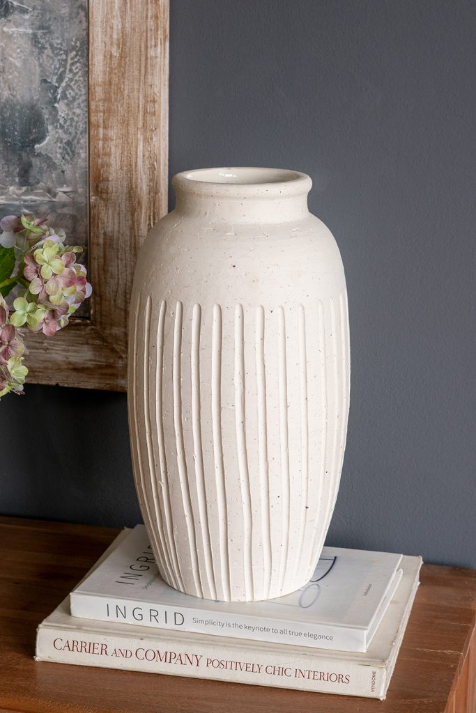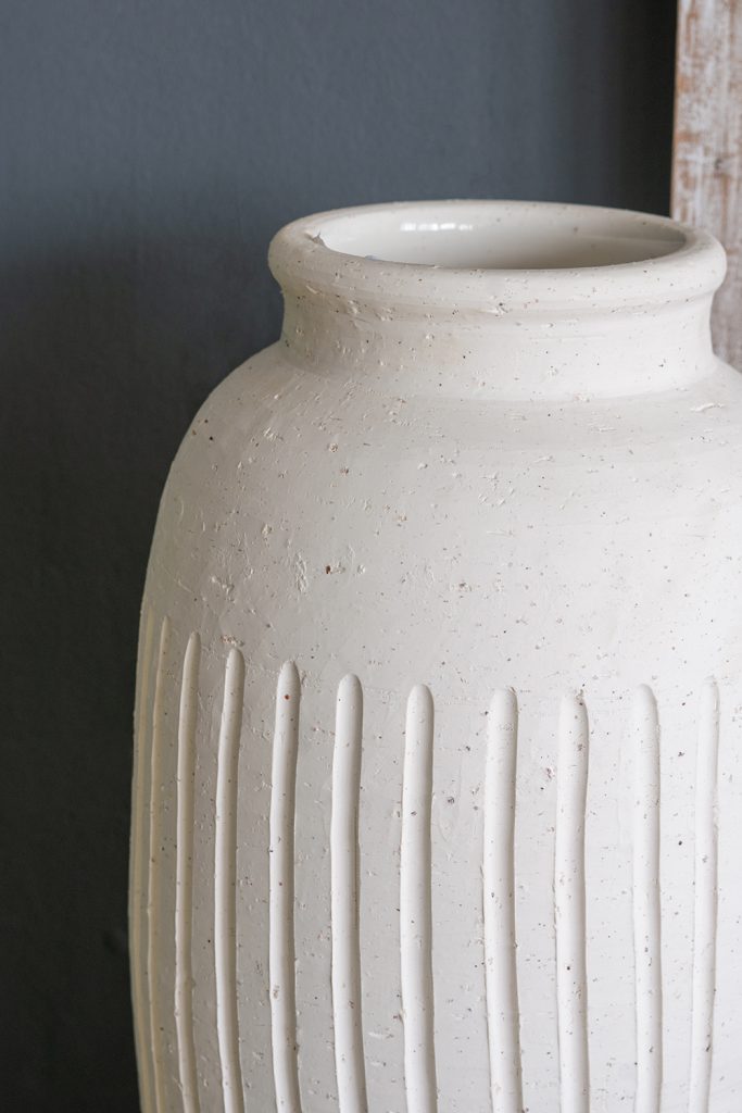 Inspired by the rugged allure of ancient pottery, this vase offers a unique, hand-pulled twist on the classic curved silhouette. Featuring a speckled white finish, raised opening, and vertical ridges, it will elevate any room in your home whether displayed alone or paired with vibrant flowers.
