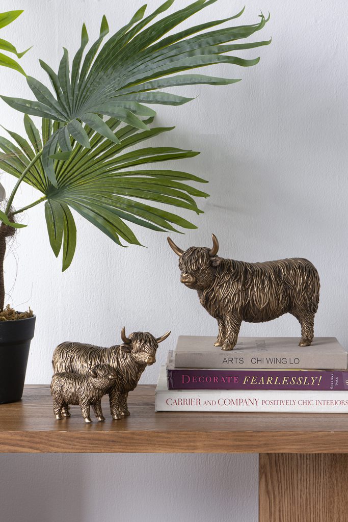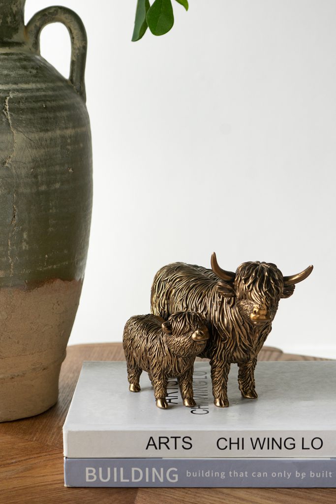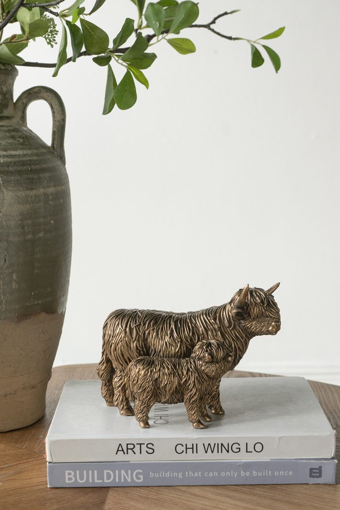 Transforming the rugged beauty of the Scottish Highland cow into a charming home accent, this figurine captures a tender moment between mother and calf, standing side by side in harmony. Finished in antique bronze with intricate detailing across their fur, horns, and hooves, it is sure to draw the eye whether displayed on its own or as part of a playful animal-themed ensemble.