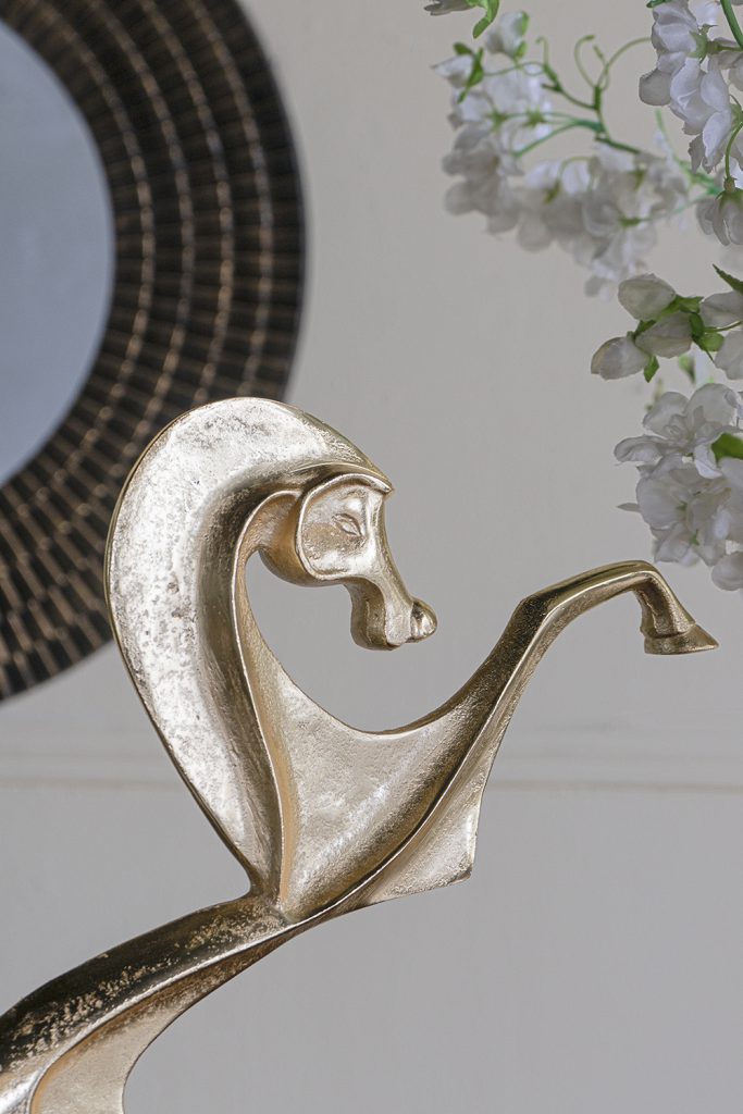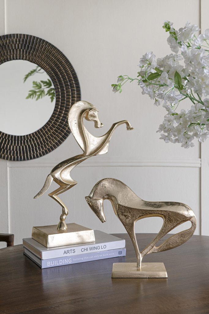Transforming the powerful beauty of nature into an abstract work of art, this horse sculpture features a fluid, sleek silhouette, a rich gold finish, and a sturdy pedestal base. Perfectly sized for any tabletop or bookshelf, it is simply a must-have for equestrian enthusiasts.
