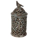 With the pierced design, fleur-de-lis top and the cutwork pattern, this artistically-crafted ceramic canister/jar/lantern will add style and elegance to your room and bring texture and character to any decor. Set a candle inside, it provides a soft glow of light that illuminates any room. It is made of ceramic and have a antiqued purple finish and unfinished areas provide textural contrast.