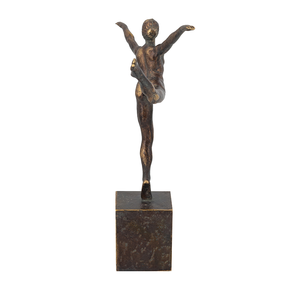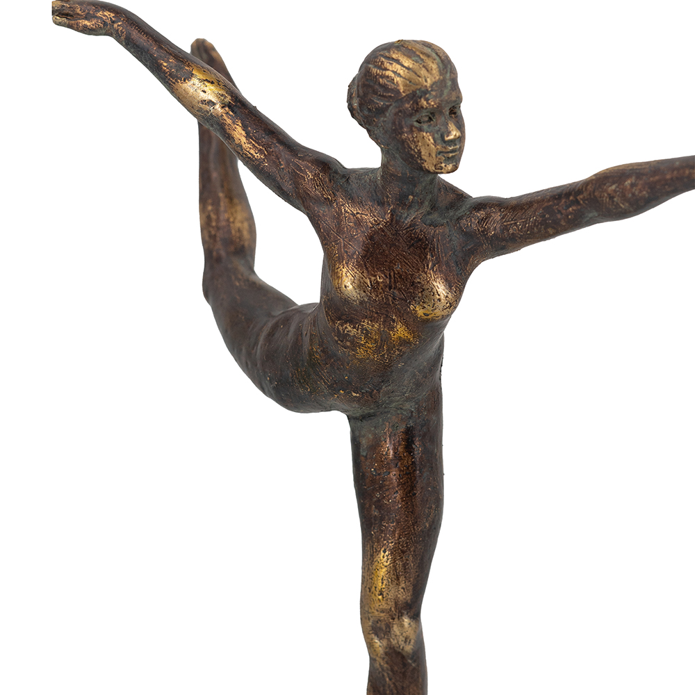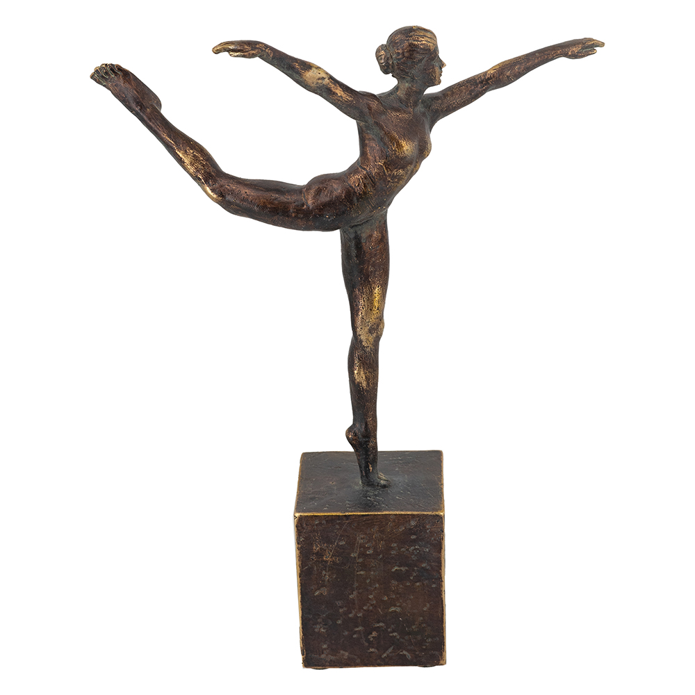 Inspired by the fluid beauty of ballet, this figurine showcases a refined arabesque pose, finished in warm antique bronze and set atop a bold pedestal base. Whether displayed alone or paired with timeless accents, it brings a touch of tranquil elegance to any living room, bedroom, or entryway.