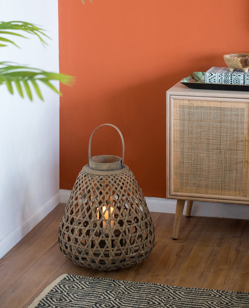 Built from strips of wood woven into a lattice design, the Coconio lantern offers a contemporary take on traditional craftwork. Display sitting on a table, shelf, or as part of a centerpiece arrangement, or use the top handle to hang from a rafter or awning. This piece measures at 17×18″ and includes an interior glass candleholder.