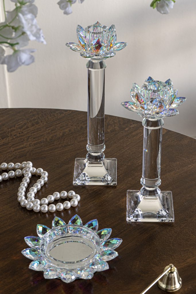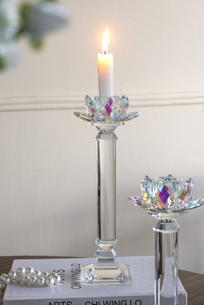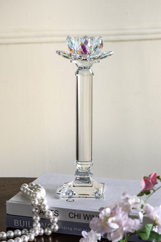 Blending the serene beauty of nature with a touch of modern luxury, this taper candle holder features a bold, column-like silhouette, a clear, elegant finish, and an intricately detailed lotus flower that shifts between shades of purple and blue depending on the light.