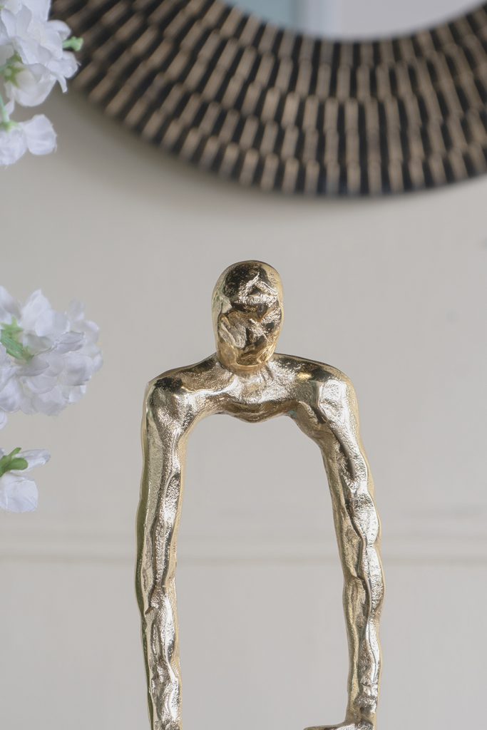 A serene display of abstract minimalism, this figurine showcases a slender, elongated take on the human form, finished in metallic gold. Perfectly sized to adorn your mantel, dining table, or office bookshelf, this sculpture will command attention whether displayed alone or as part of a rich centerpiece arrangement.