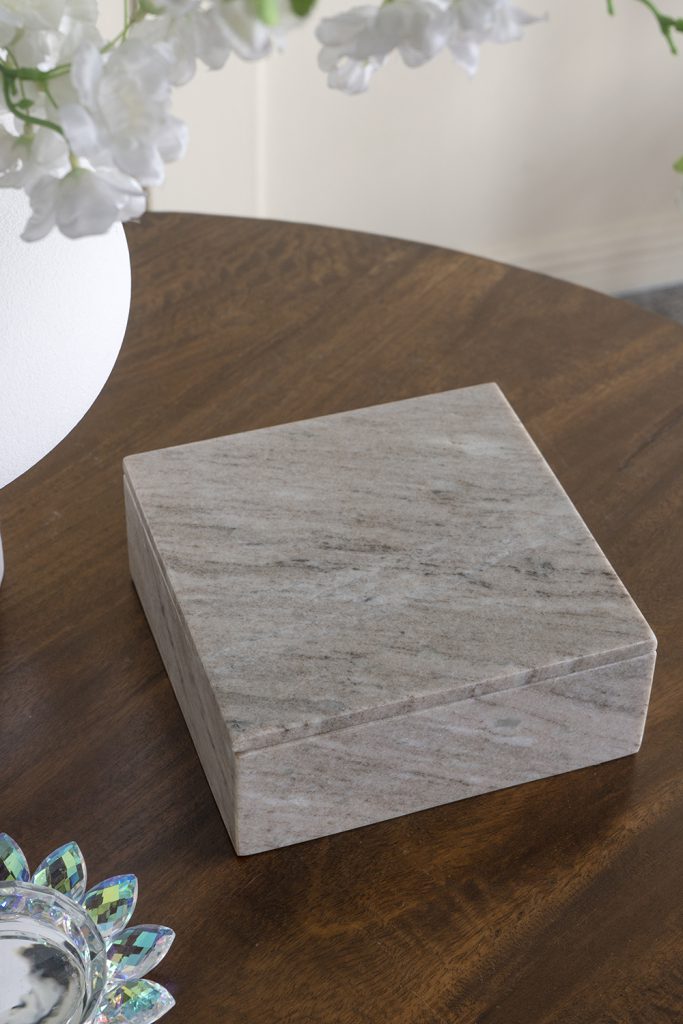 Infusing organic design with a touch of modern minimalism, this decorative storage box features a sleek square silhouette, a polished gray finish, and understated veining. Whether used to hold trinkets, household essentials, or jewelry, it will elevate the decor in your living room, entryway, bedroom, or office.