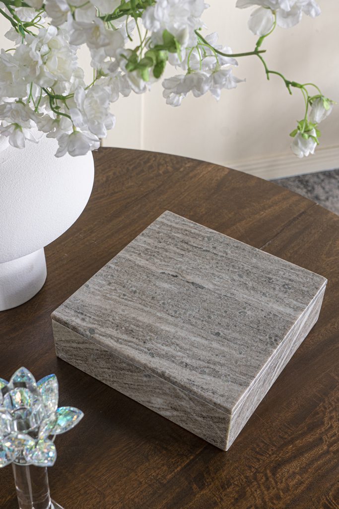 Infusing organic design with a touch of modern minimalism, this decorative storage box features a sleek square silhouette, a polished gray finish, and understated veining. Whether used to hold trinkets, household essentials, or jewelry, it will elevate the decor in your living room, entryway, bedroom, or office.