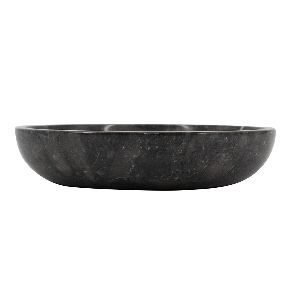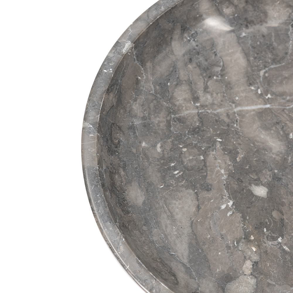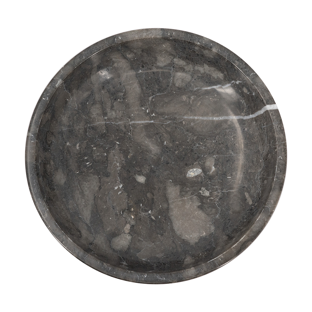 This premium round bowl, handcrafted from genuine marble, boasts deep gray tones with striking white veining and a glossy polish for sophisticated appeal. Its shallow, simple design makes it perfect as a tabletop centerpiece, key tray, or jewelry holder in modern, industrial, or minimalist interiors. Durable and heavyweight, it adds natural luxury to any room.