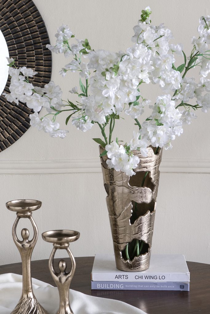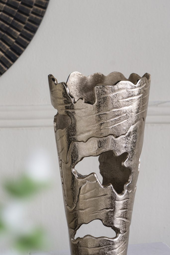 Capturing the effortless intrigue of raw design, this vase features organic cut-out patterns and an alluring gold ombre finish, creating a luxurious work of art. Whether displayed individually, as part of a rich ensemble, or paired with vibrant faux flowers, it will bring an instant touch of charm to any tabletop, counter, or shelf.