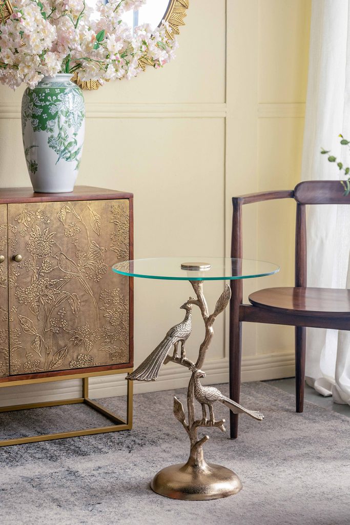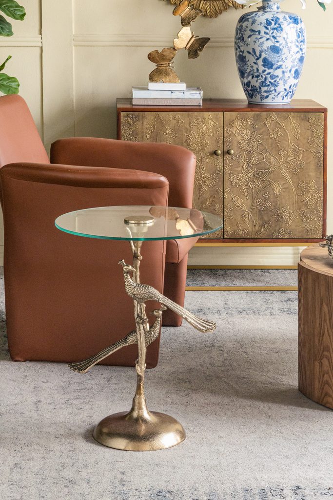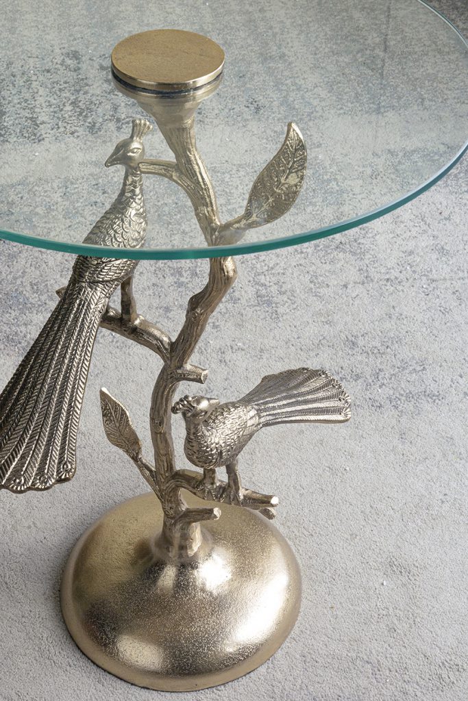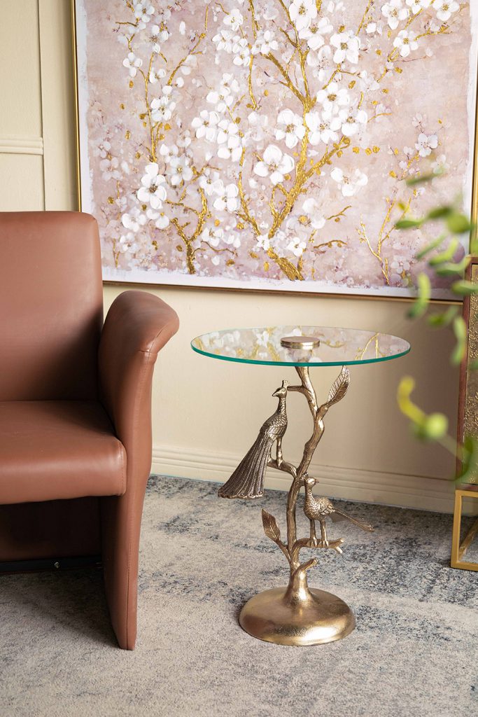 Breathing fresh life into the classic round side table, this piece features an intricate, branch-inspired body, whimsical peacock accents, and a rich gold finish. Offering great versatility, it is perfectly sized to act as an end table, display pedestal, or plant stand, infusing any room in your home with a touch of artistic charm.