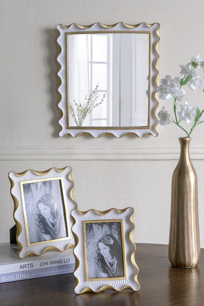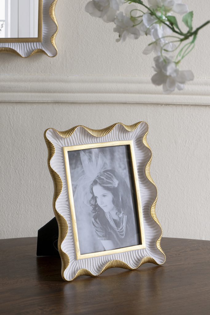 Inspired by the eye-catching beauty of Hollywood Regency design, this photo frame features an intricately scalloped silhouette. Finished in a blend of white and rich gold, it elevates any space while offering lasting protection for your most cherished memories.