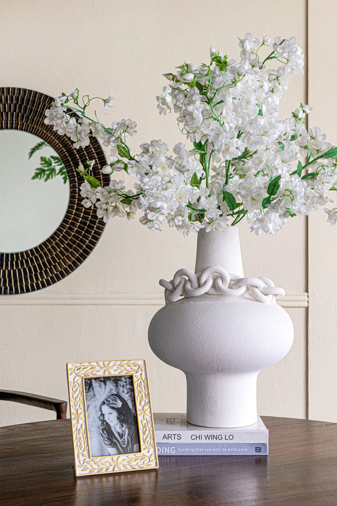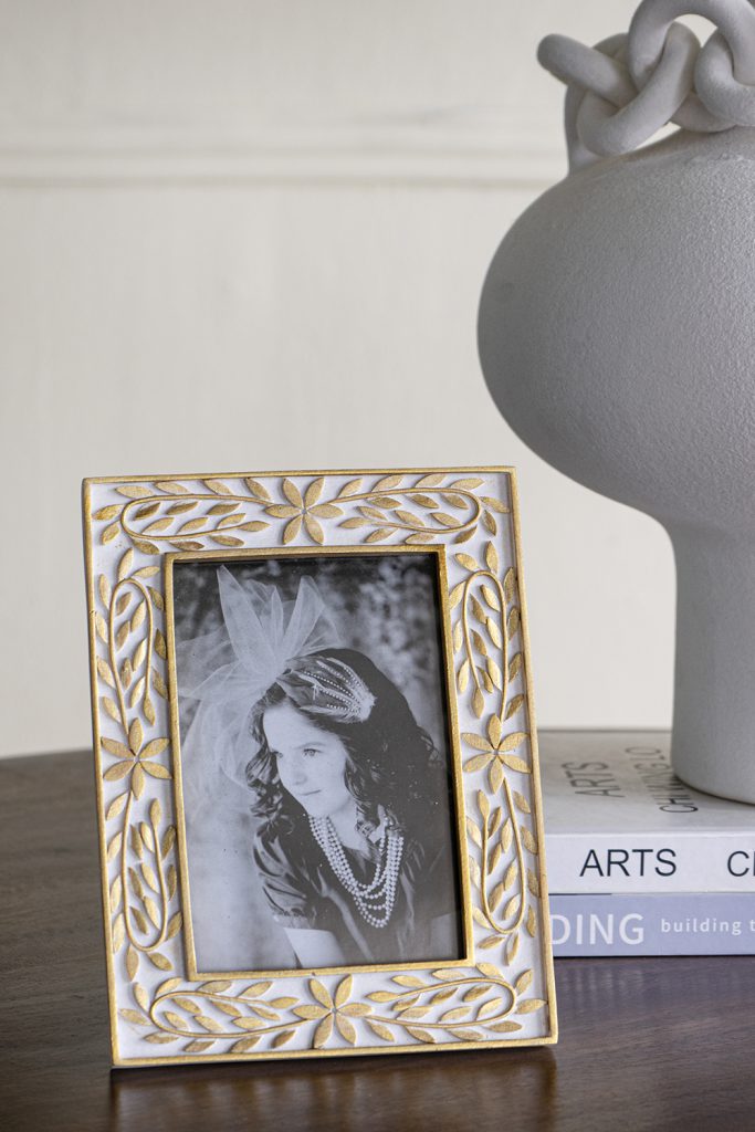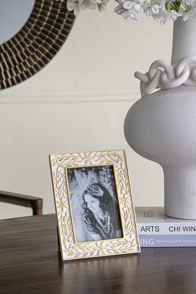 Transforming the sprawling beauty of nature into a versatile home accent, this photo frame features a clean rectangular design, a soft white and gold finish, and intricately detailed botanical motifs. Perfectly sized for any mantel, sideboard, or nightstand, it will elevate your decor while protecting your cherished memories.