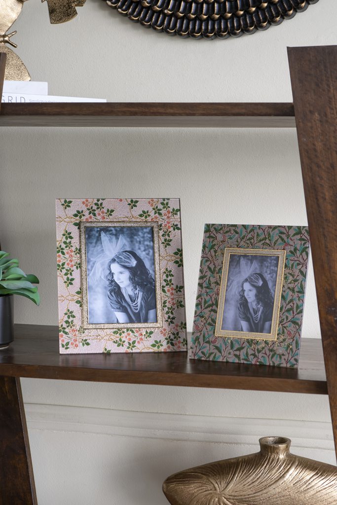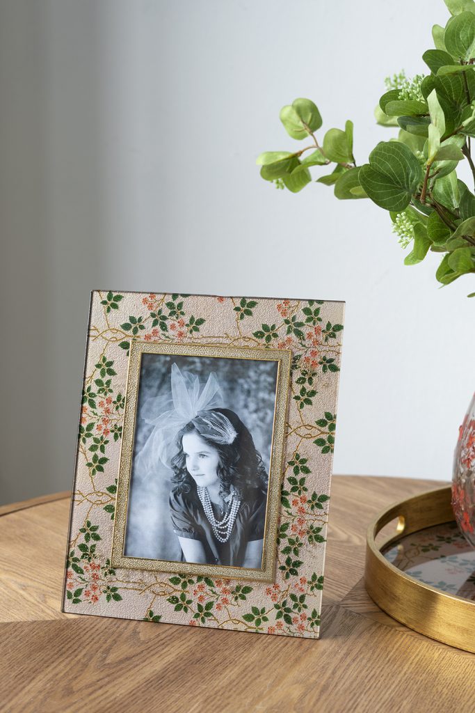 Inspired by vintage hand-painted art, this photo frame is adorned with delicate botanical motifs captured in a blend of green and pink tones. Perfectly sized for a nightstand, mantel, or tabletop, it protects your cherished memories while infusing any space with a burst of garden charm.