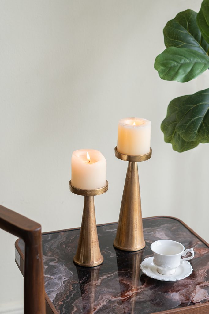 Showcasing the luxurious side of minimalist design, this candle holder features a sleek tapered silhouette, a circular top, and a warm gold finish. Pair it with a pillar candle to spread a delicate, relaxing glow throughout your living room, dining room, entryway, or office.