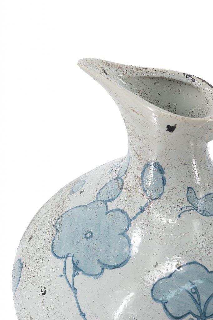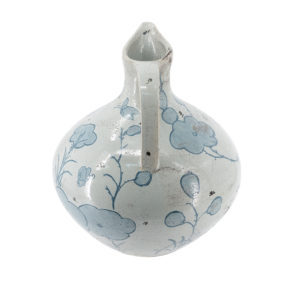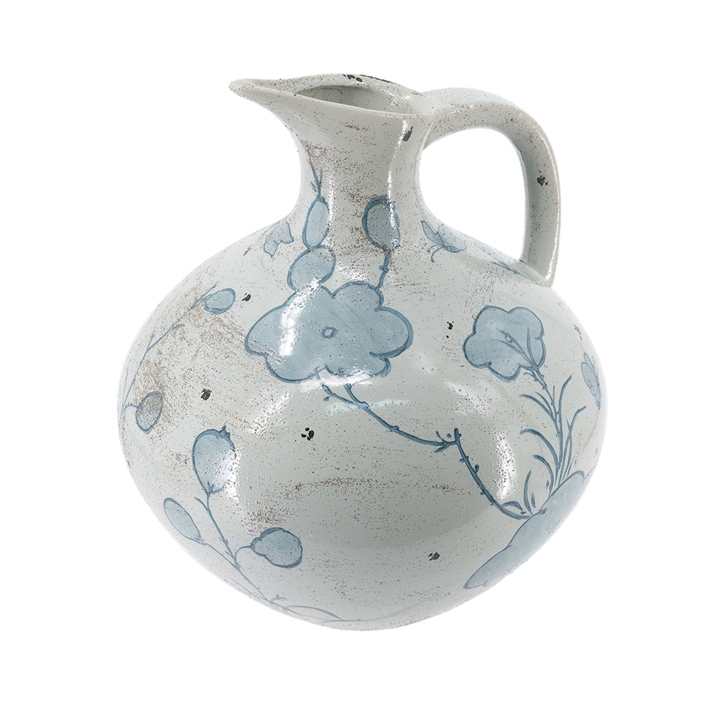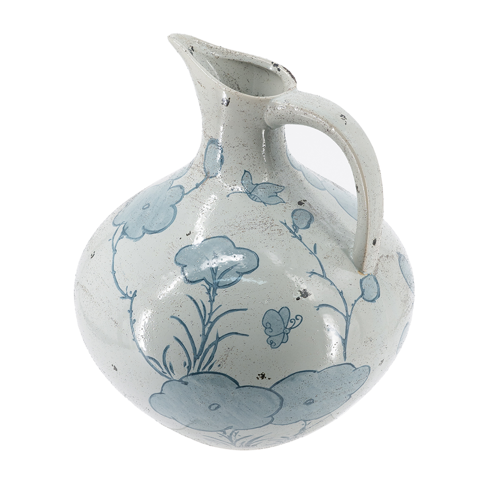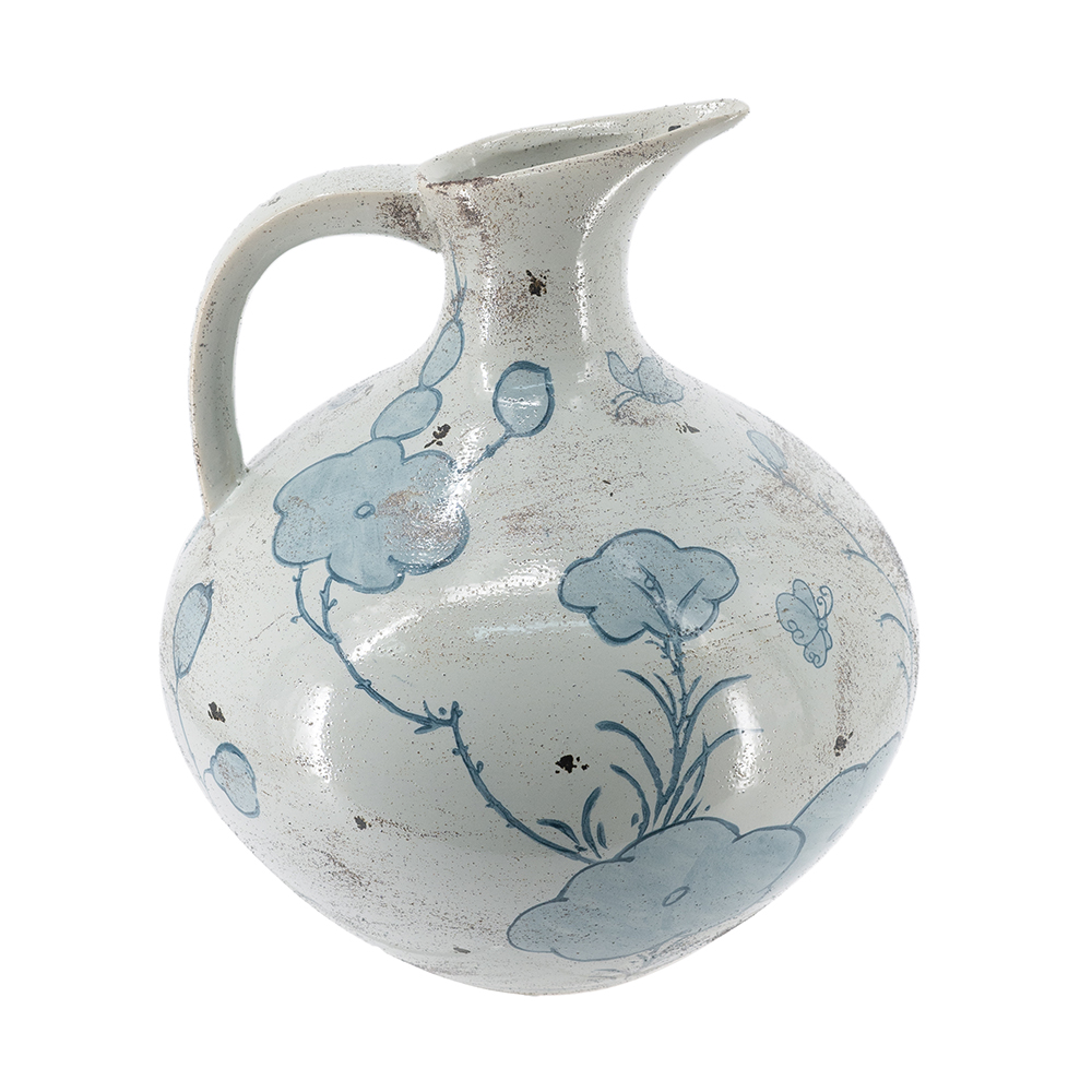 Evoking the refined allure of vintage European pottery, this pitcher vase features a wide, bulbous silhouette, an elongated spout, and a soft white glaze adorned with abstract blue floral motifs. Crafted from durable ceramic, it offers lasting beauty and serves as a bold addition to any living room, kitchen, or entryway.