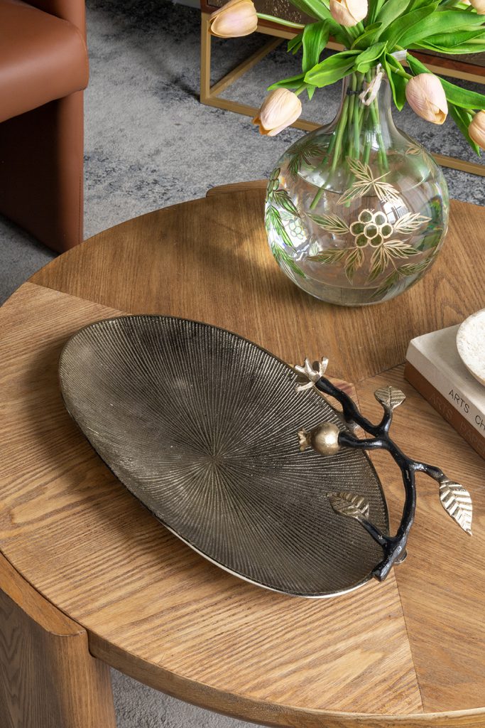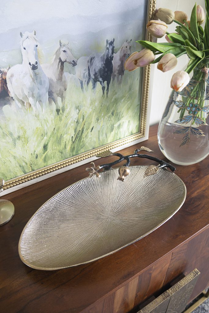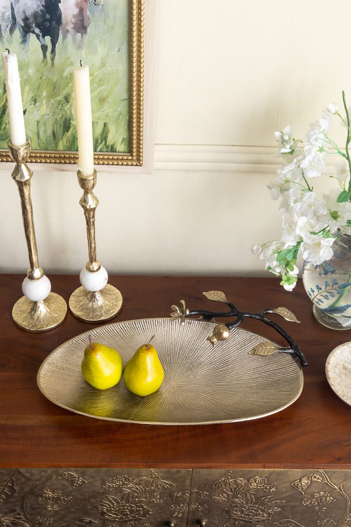Drawing inspiration from the effortless beauty of nature, this tray features a textured oval silhouette, a metallic gold finish, and an intricately crafted branch accent. Whether placed on your tabletop, console, mantel, or vanity, it will infuse your decor with a burst of organic charm.