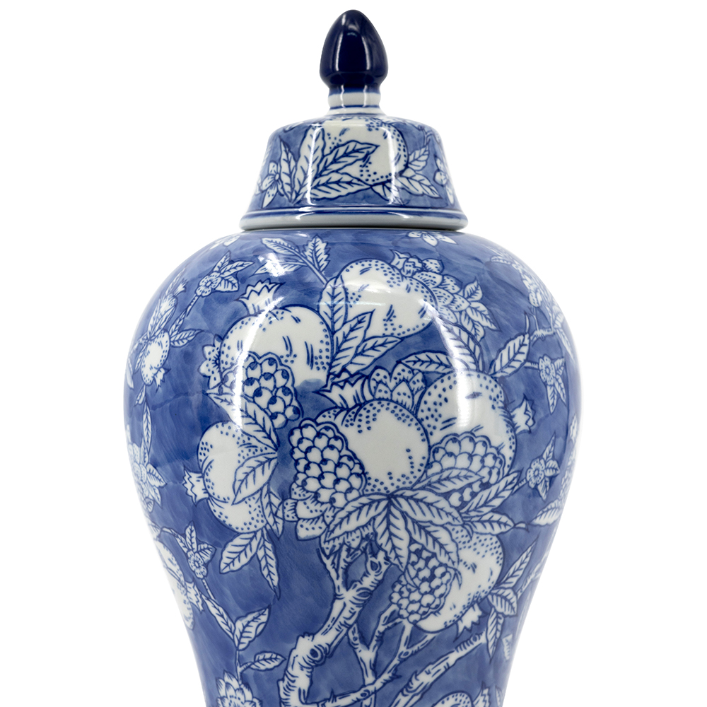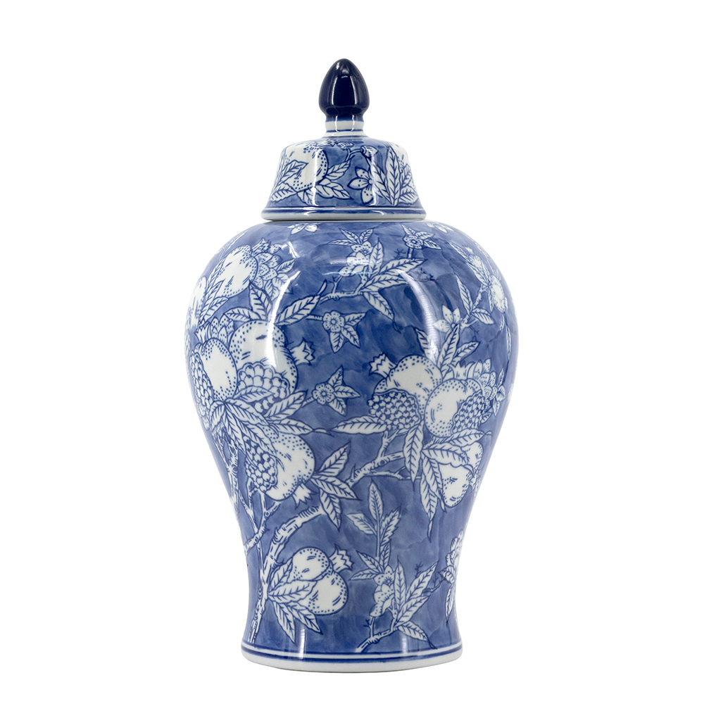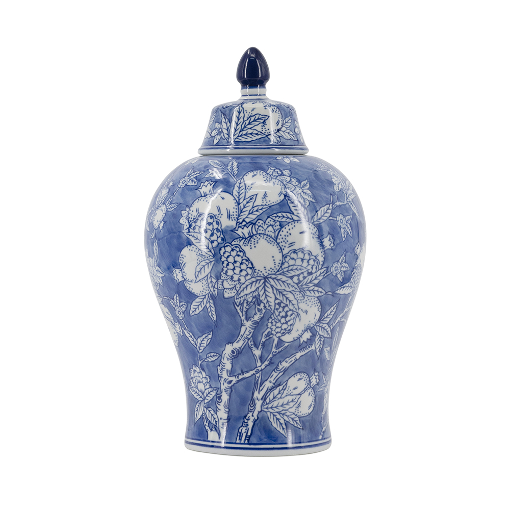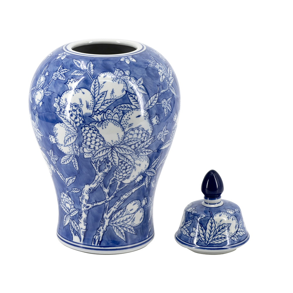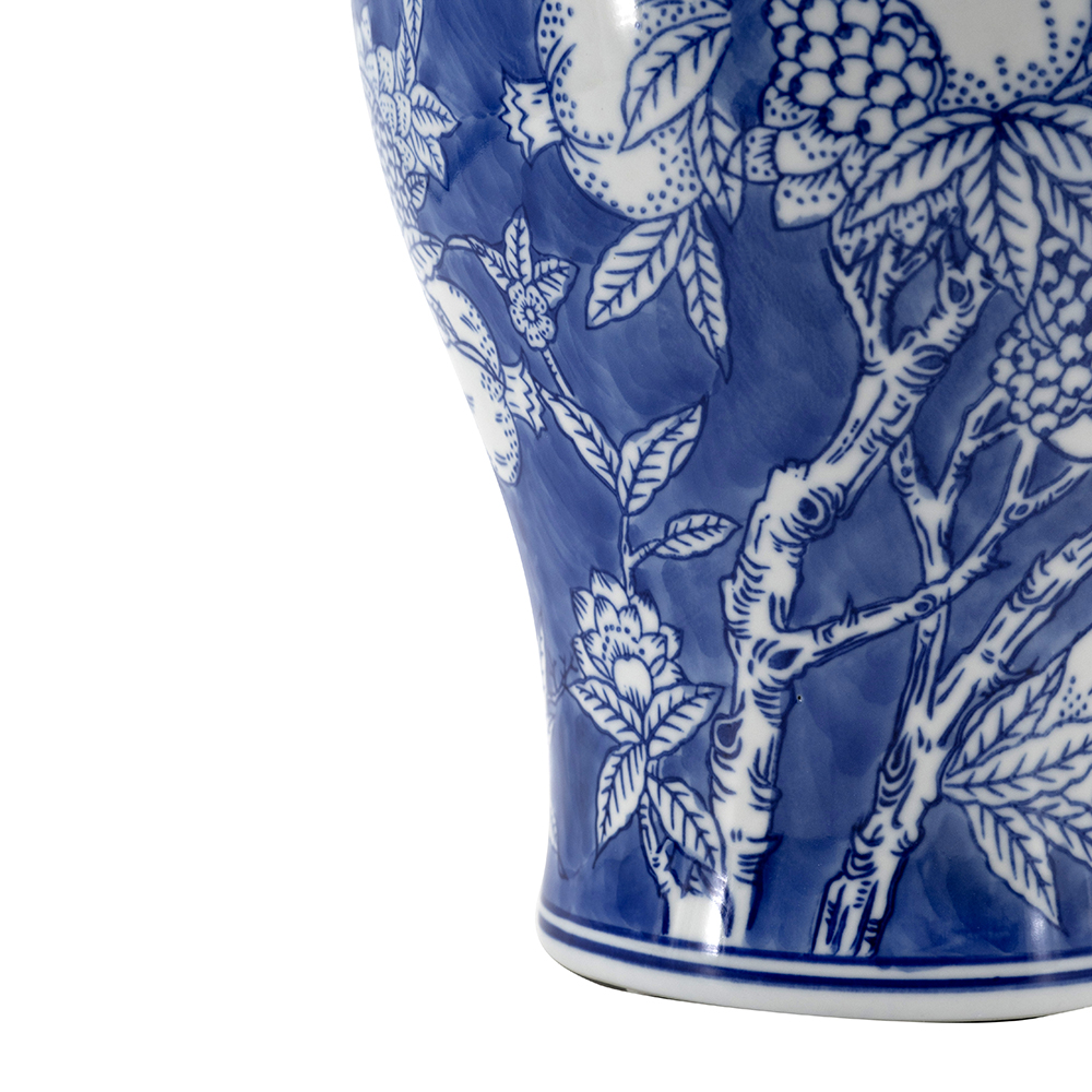 This stunning porcelain ginger jar features a classic blue and white palette with intricate floral and pomegranate motifs for timeless Chinoiserie charm. Its glossy finish and removable lid make it ideal as a vase, storage jar, or decorative piece in traditional, coastal, or modern interiors. Lightweight yet durable, it adds sophisticated elegance to mantels, shelves, or tables.