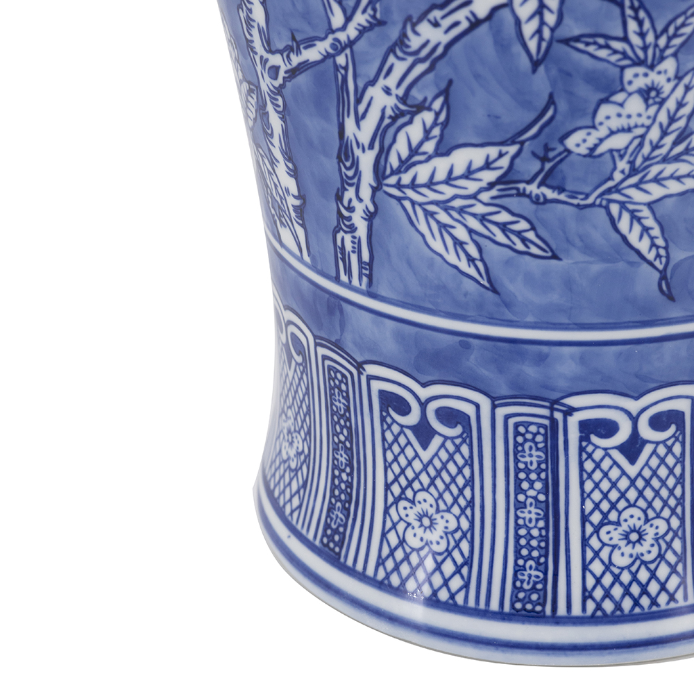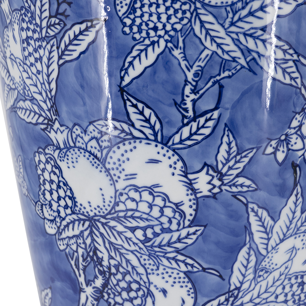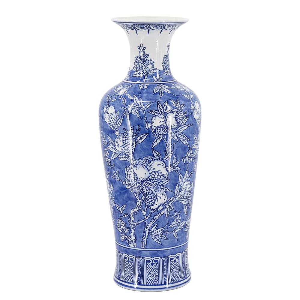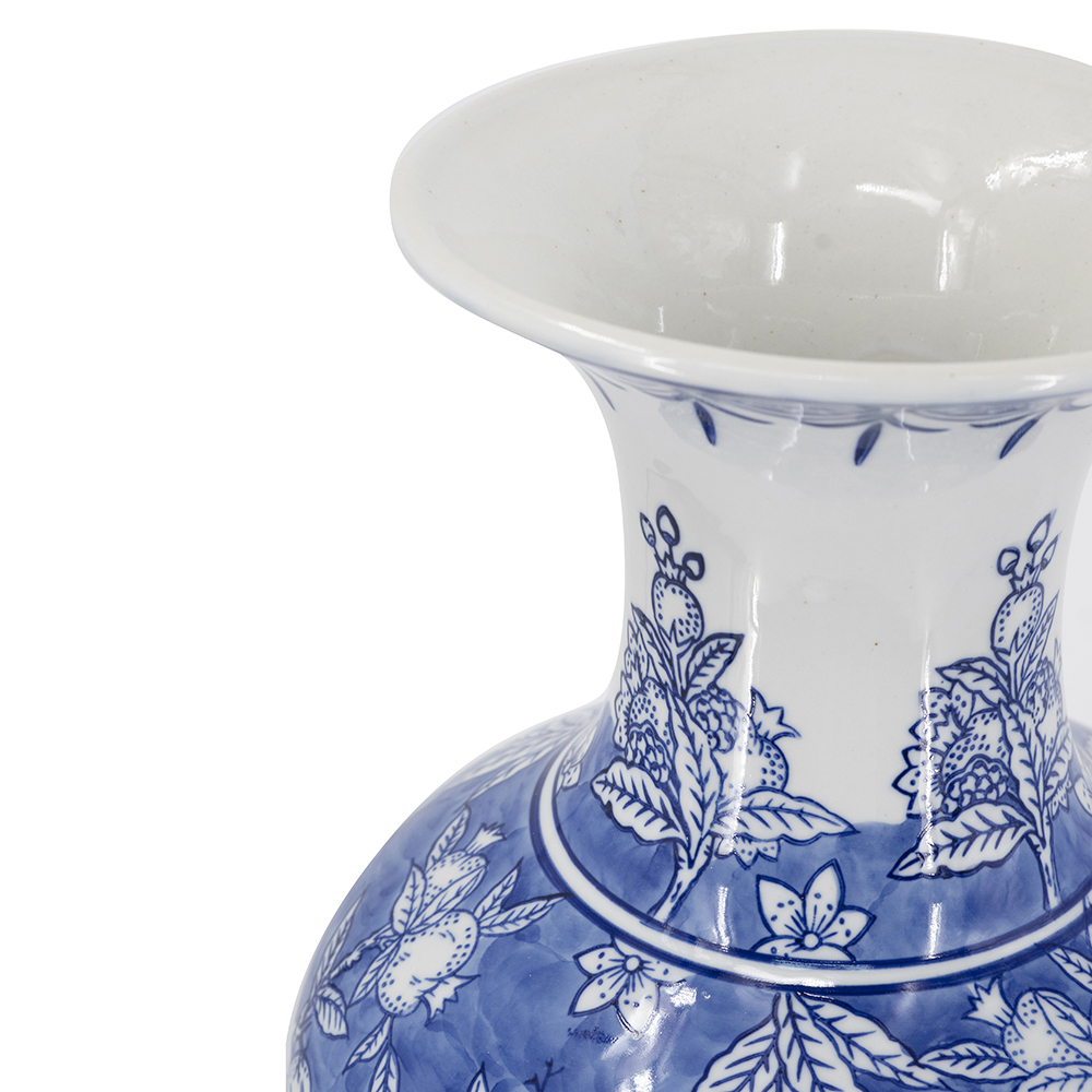 Elevate your home with this exquisite blue and white porcelain vase in timeless Chinoiserie style. It features intricate designs of lush branches, and ripe pomegranates, symbolizing prosperity and abundance. Crafted from lightweight porcelain, it’s ideal for fresh or dried arrangements or as a standalone accent. Perfect for living rooms, mantels, and a great gift for housewarmings or weddings.