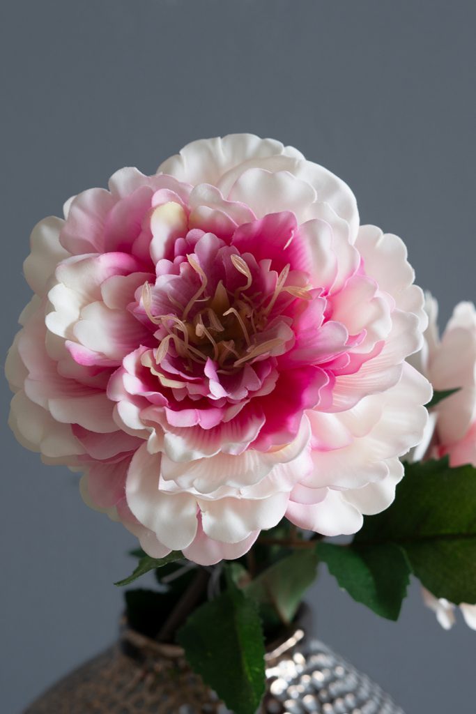 Capturing the graceful beauty of English countryside gardens, this artificial peony features a long, slender stem, lifelike green leaves, and layered cream and pink petals. Whether paired with a tall vase, centerpiece bouquet, or event display, it infuses any space with romantic charm.