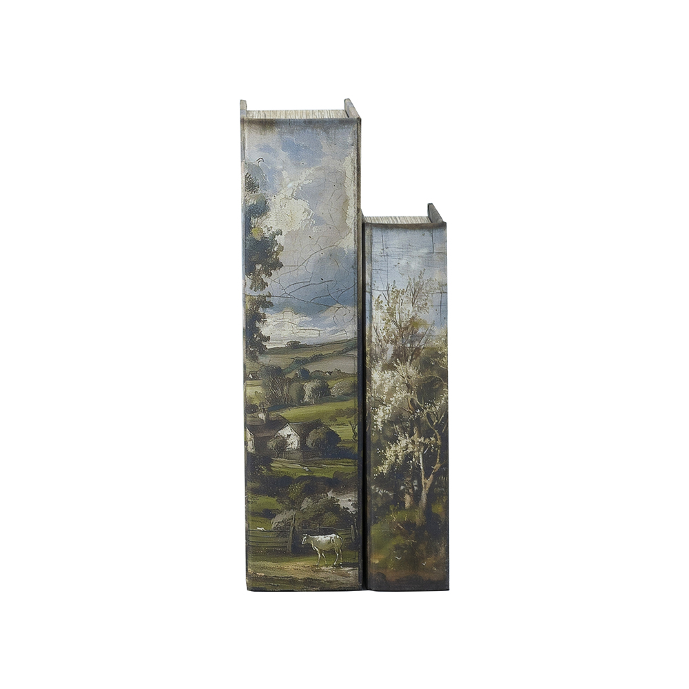 Organize with elegance using this set of 2 vintage-inspired book boxes, featuring serene countryside landscapes with trees, houses, ponds, and cows on durable MDF and canvas for a nostalgic, artistic touch. Perfect for storing trinkets on shelves or desks, adding farmhouse charm to any room. Ideal as functional decor or gift, blending timeless art with practical hidden storage.