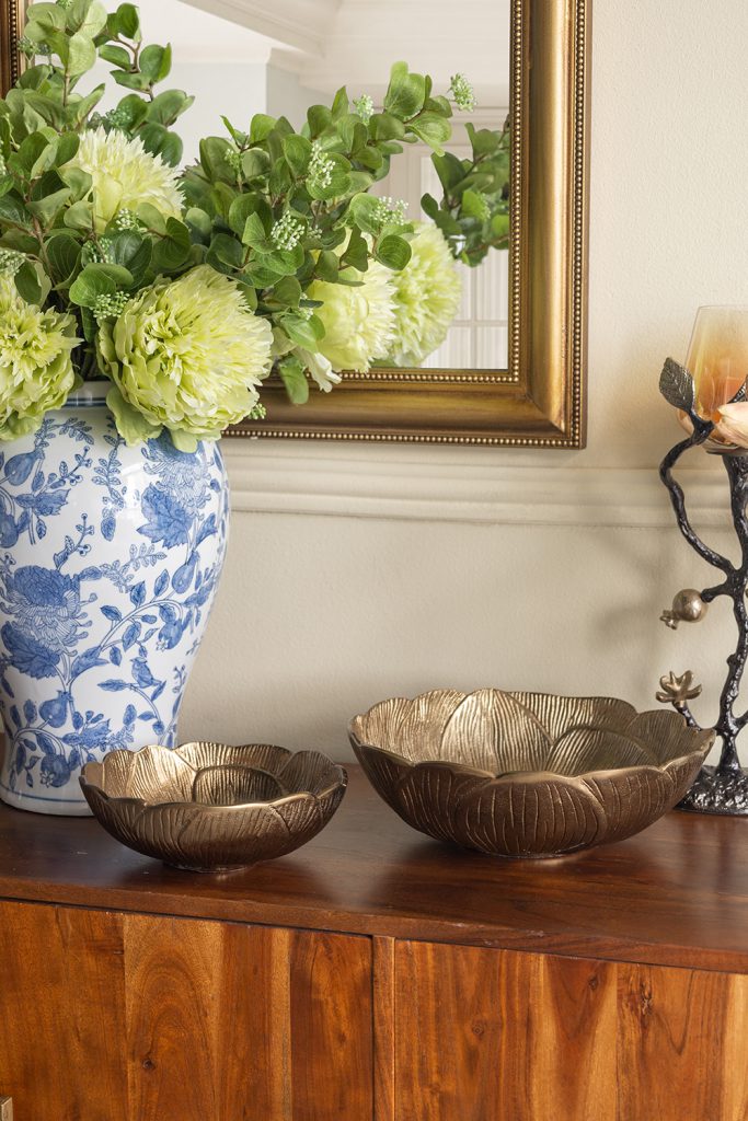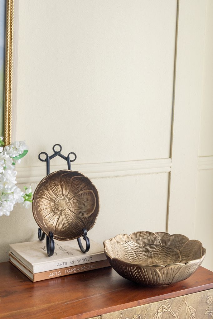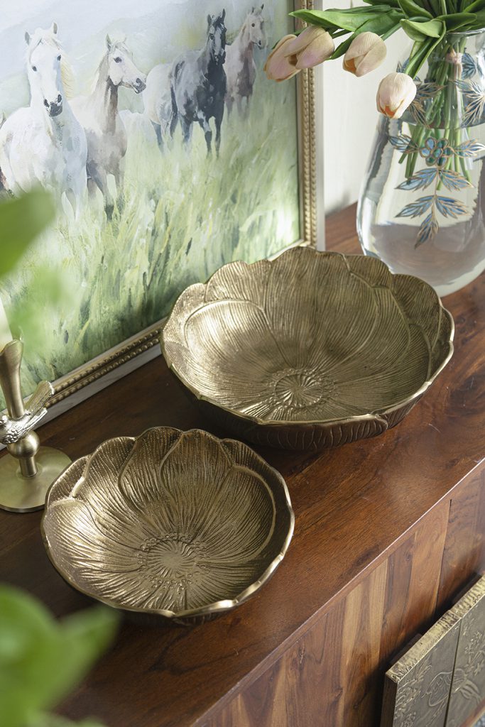 Drawing inspiration from the effortless allure of nature, each bowl boasts a textured leaf-like silhouette, raised scalloped edges, and a warm gold finish. Use them as decorative catchalls, stylish fruit bowls, or to hold a vibrant centerpiece arrangement.