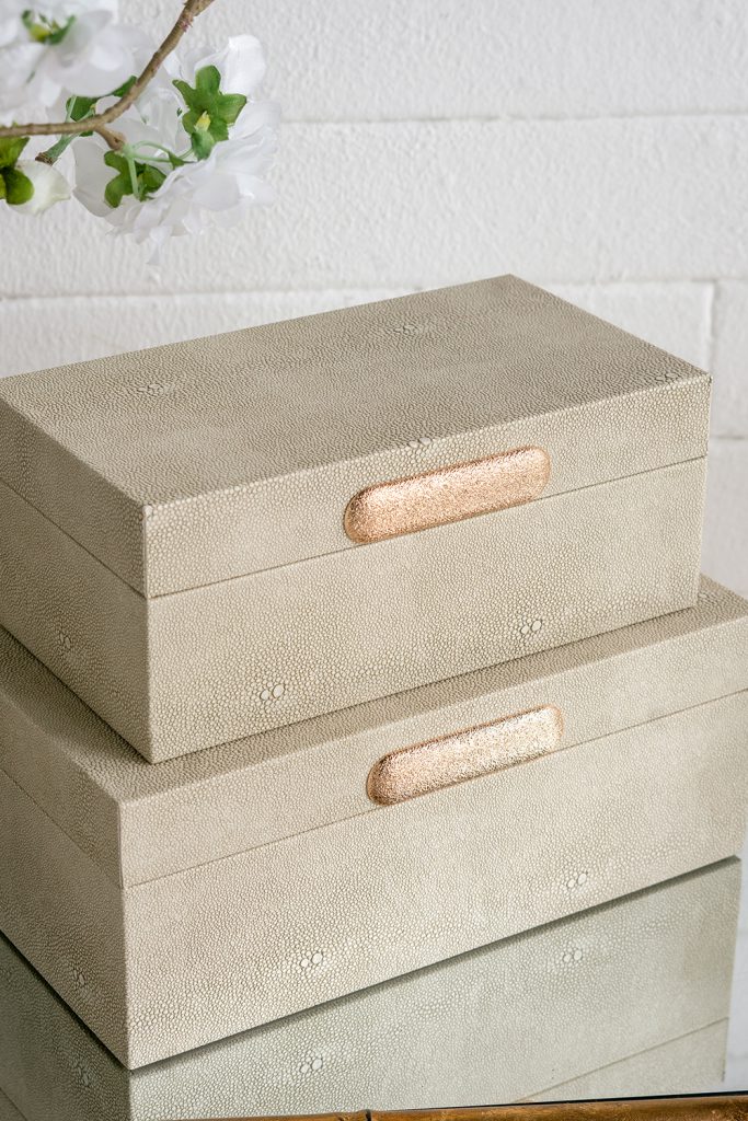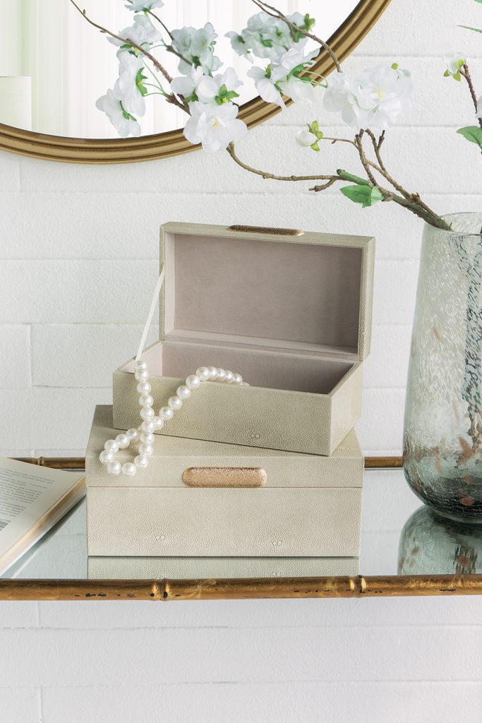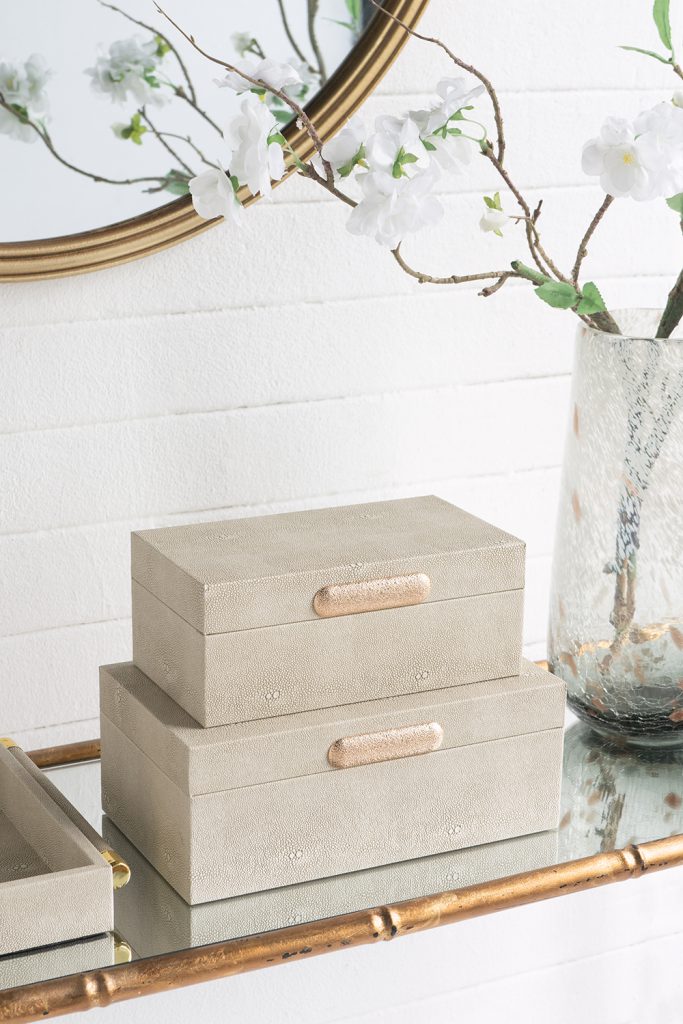 Blending vintage charm with modern elegance, each box features a classic rectangular silhouette and a soft gray faux leather finish. Ideally sized for storing essentials, trinkets, jewelry, and more, they are sure to catch the eye from any tabletop, dresser, or shelf.