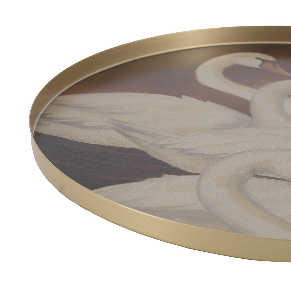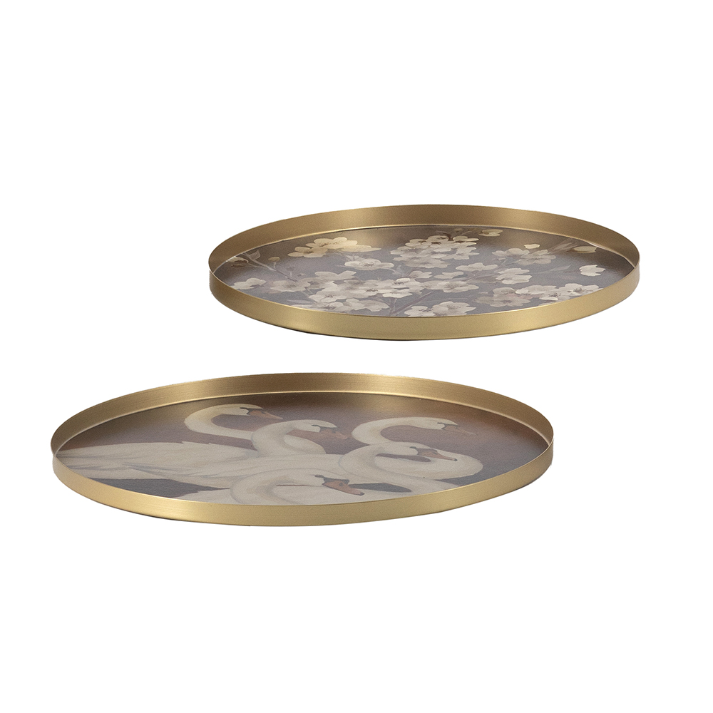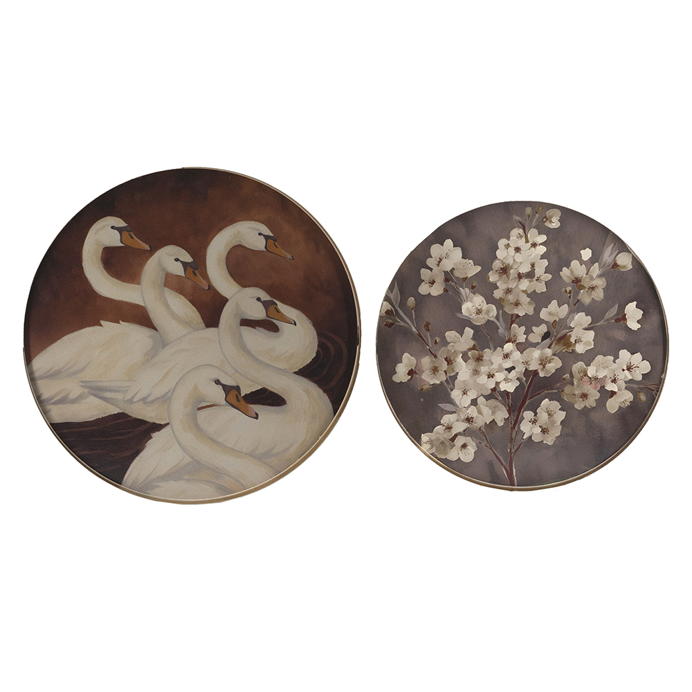 Add artistic elegance to your space with this set of 2 trays, featuring vintage swan pond and cherry blossom designs in muted tones with gold rims for timeless appeal. Perfect for displaying candles, jewelry, or small decor on coffee tables, shelves, or vanities. Durable and lightweight, these versatile pieces blend artwork w/ modern sophistication, ideal as functional accents or thoughtful gifts.