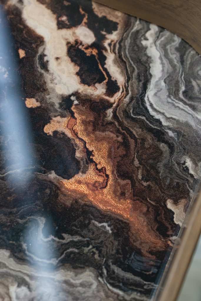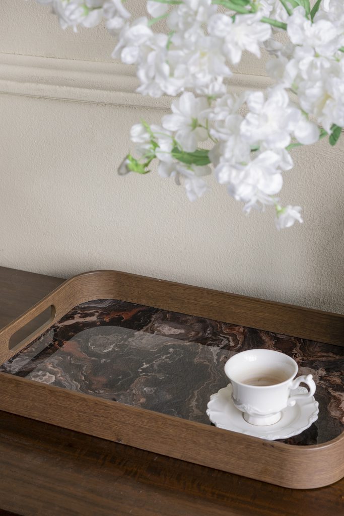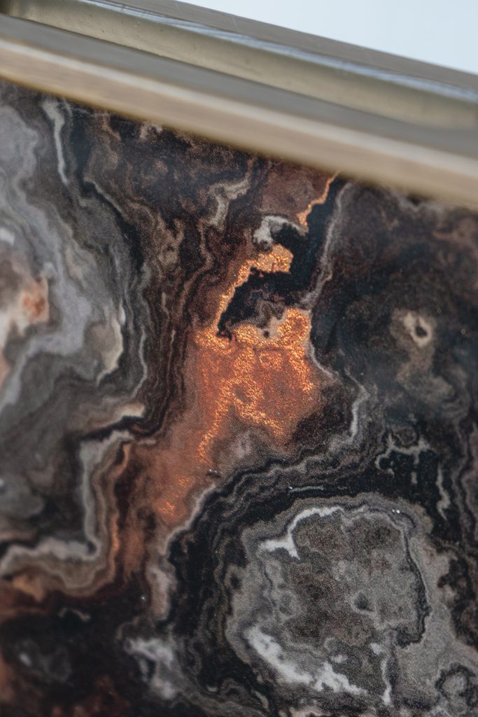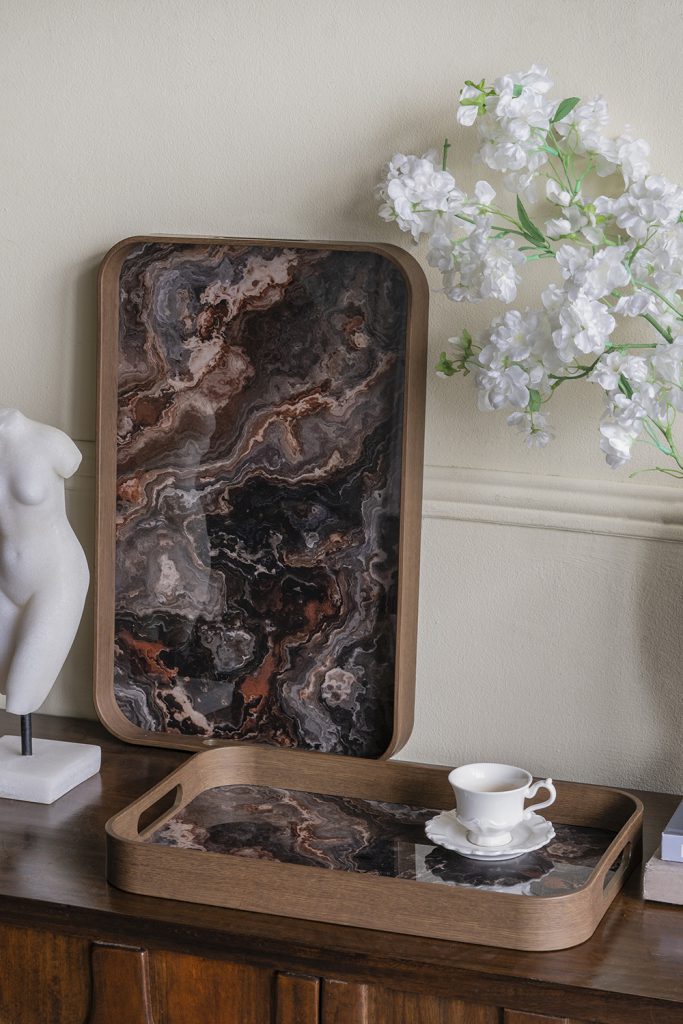 Blending the allure of abstract art with the charm of nature, these trays feature a sleek rectangular silhouette, raised gold-finished edges, and a swirling marbled motif in shades of black, bronze, and copper. Complete with built-in handles, they provide a convenient and stylish way to elevate any tabletop, sideboard, dresser, or counter.