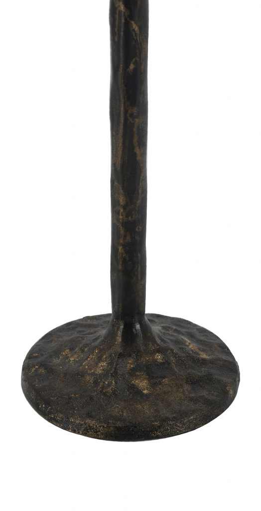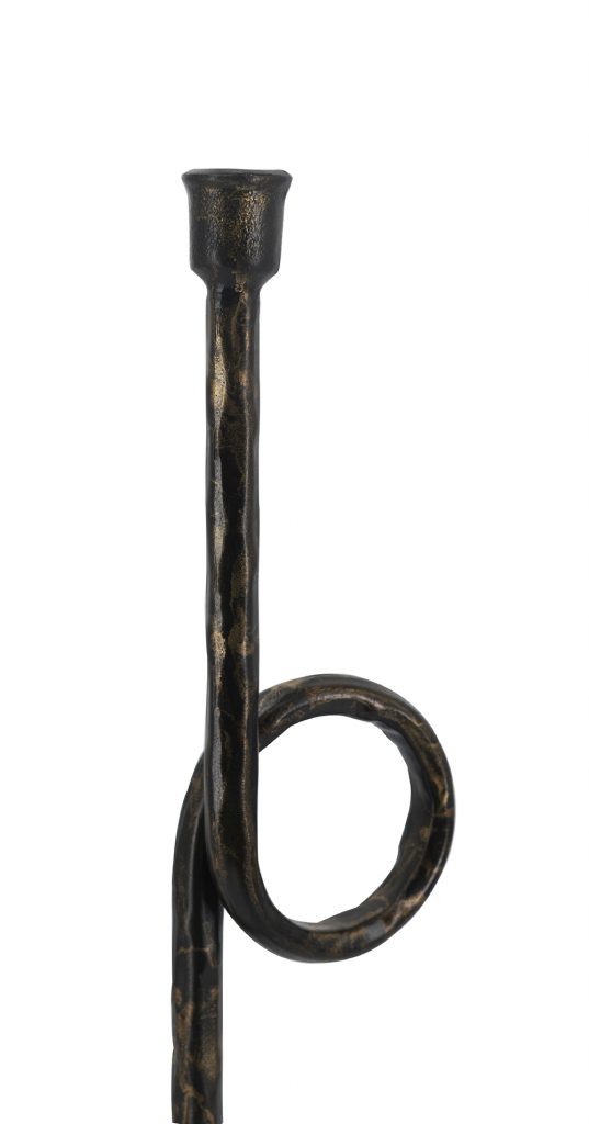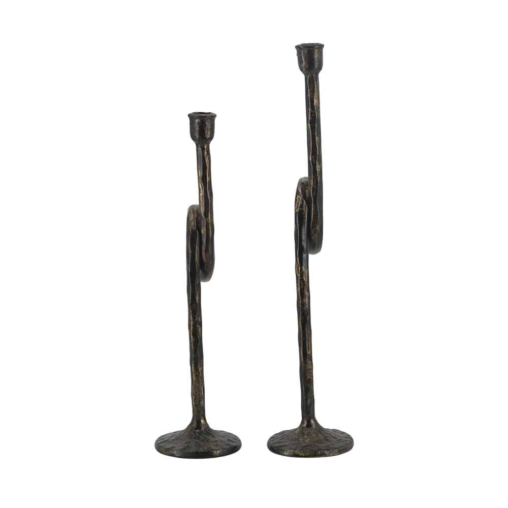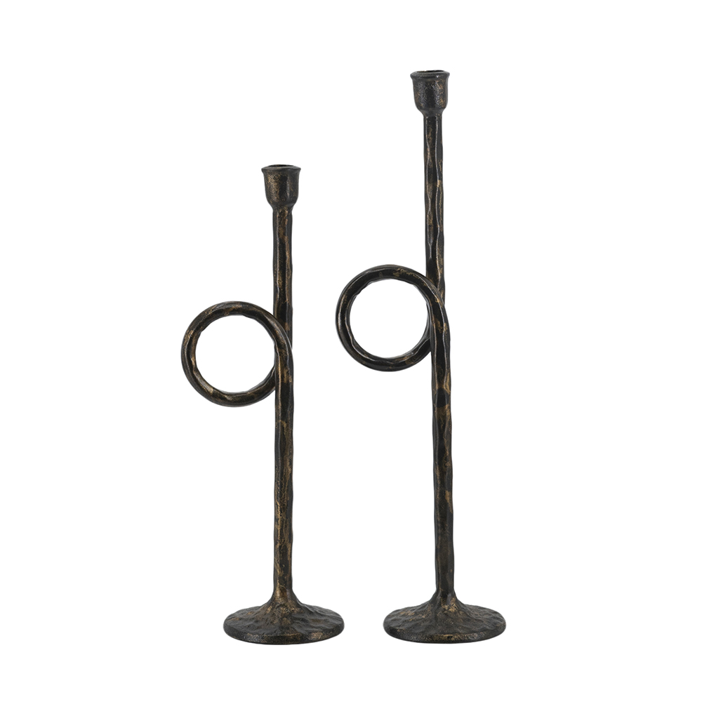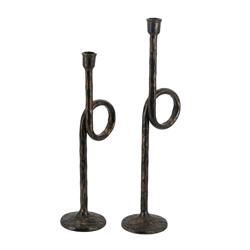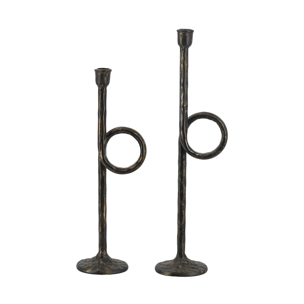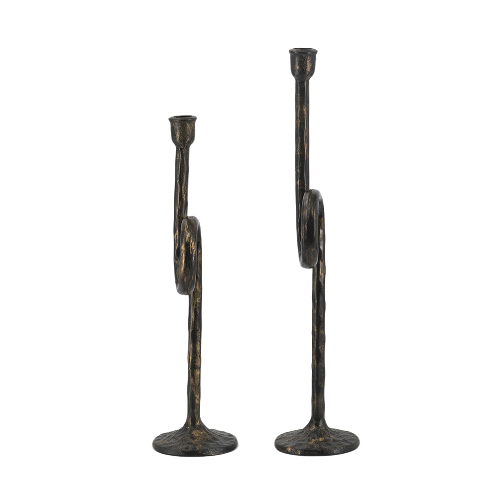 Drawing inspiration from the rugged charm of vintage metalwork, each candle holder features a slender silhouette, a graceful looping form, and a rich blend of textured black and gold tones. Whether displayed together as a centerpiece duo or placed separately, they cast a warm, soothing glow across any space when paired with taper candles.