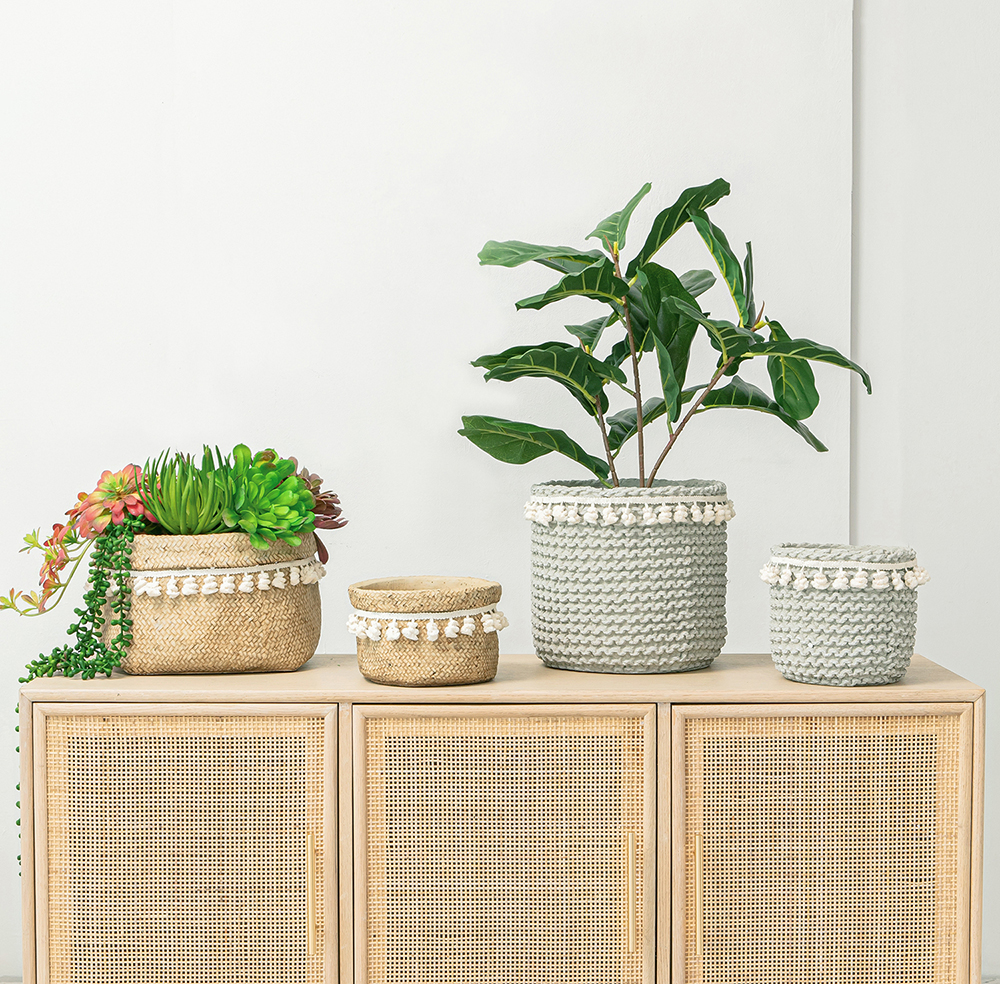 Featuring a knitted basket design, a raw earthy gray finish, and a playful white pom-pom trim, these planters bring a carefree charm to any space. Whether displayed individually or as a centerpiece pairing, they effortlessly capture attention in a garden, patio, living room, or entryway, comfortably holding a small to medium plant collection.