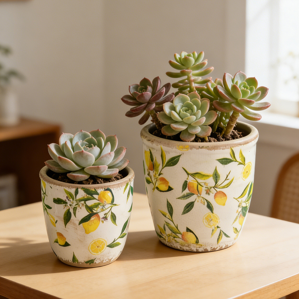 Masterfully crafted from sleek, high-quality ceramic, each planter embodies classic farmhouse style, with a vibrant lemon motif that pops against a white surface. Perfect on their own or paired with a colorful collection of succulents or trailing plants, they will elevate your living room, dining room, or entryway decor.