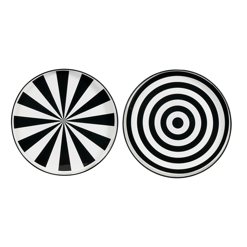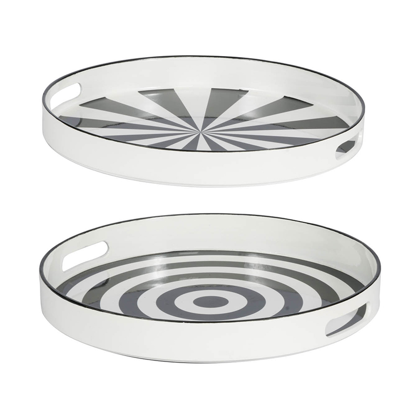This set of two Quinn Black and White Round Trays features bold,dynamic patterns in classic colors for a versatile look that complements a variety of styles.Display these trays against a backsplash in a chic kitchen,use them to serve trendy cocktails at your next gathering,or feature collectibles on them in a retro living room.These versatile trays make every day a special occasion.