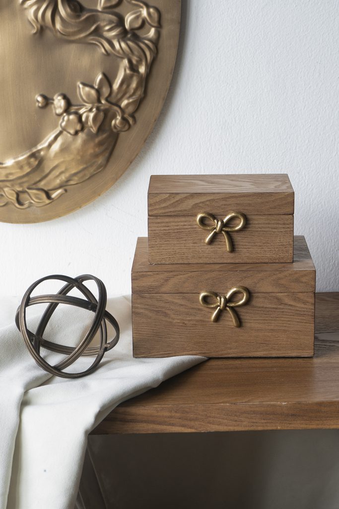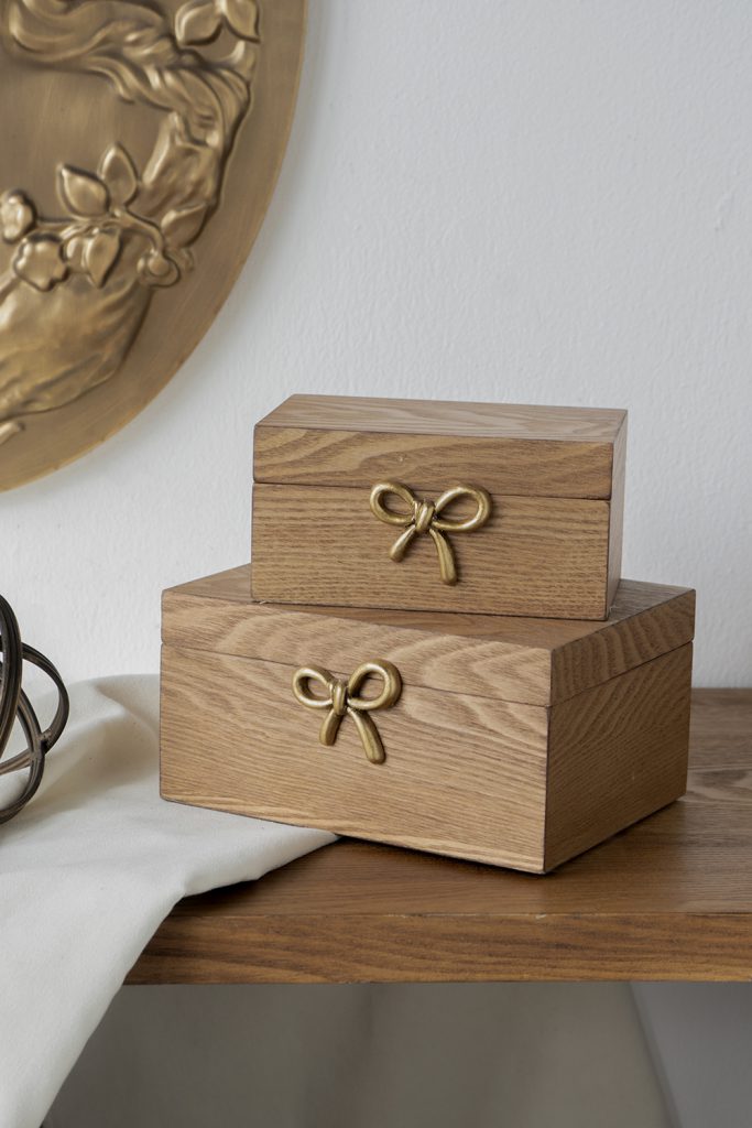 Blending nostalgic charm with earthy beauty, these storage boxes feature a classic rectangular design, a grained ash veneer, and a whimsical golden bow accent. Perfectly sized for essentials, trinkets, jewelry, and more, they are sure to catch the eye from any tabletop, dresser, or shelf.