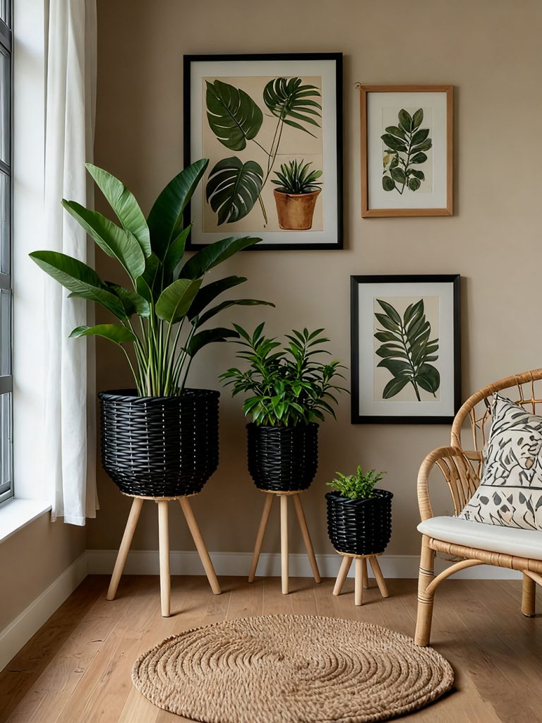 Capturing the charm of organic design, these baskets feature a rugged rope-inspired texture, a striking black finish, and three tapered wooden legs that add height to the visuals. Perfectly sized to serve as convenient storage or decorative planters, they will draw the eye whether displayed individually or as a centerpiece trio in your living room, bedroom, or entryway.