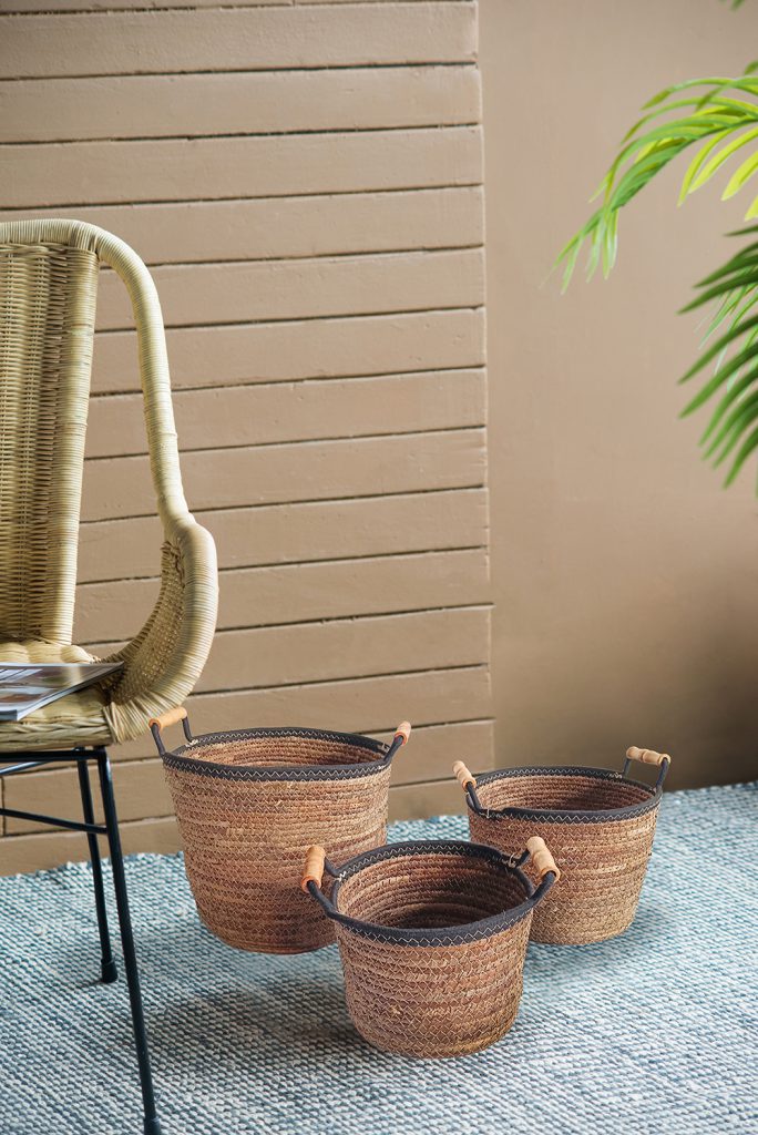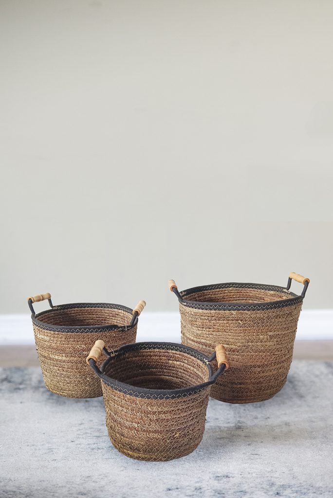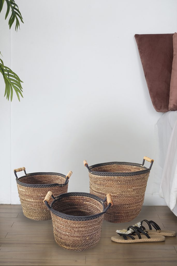 Inspired by traditional handwoven designs, these baskets feature a richly textured brown finish, a bold black cotton rim, and sturdy wooden handles. Crafted from durable, eco-friendly banana leaf, they offer long-lasting beauty and convenient handling, making them a striking addition to any living room, entryway, or bedroom.