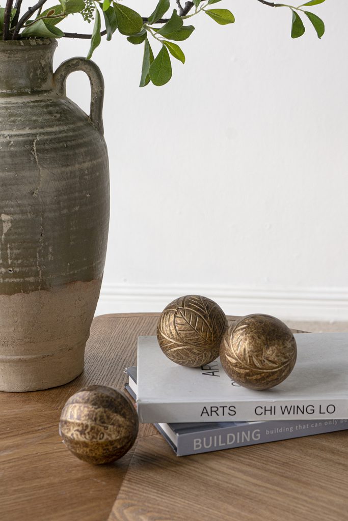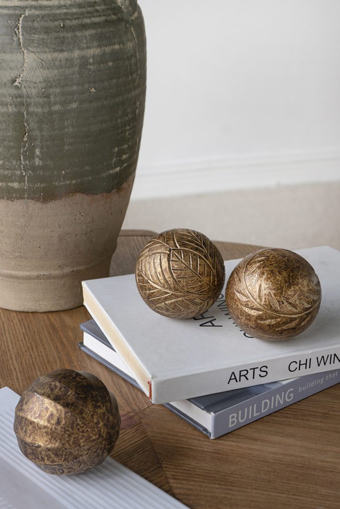 Reimagining the classic decorative orb as an earthy statement piece, each ball features a radiant gold finish and a carved, organic texture. Whether displayed individually on a mantel or bookshelf, or grouped in a centerpiece bowl or tray, this set is sure to elevate your home decor.