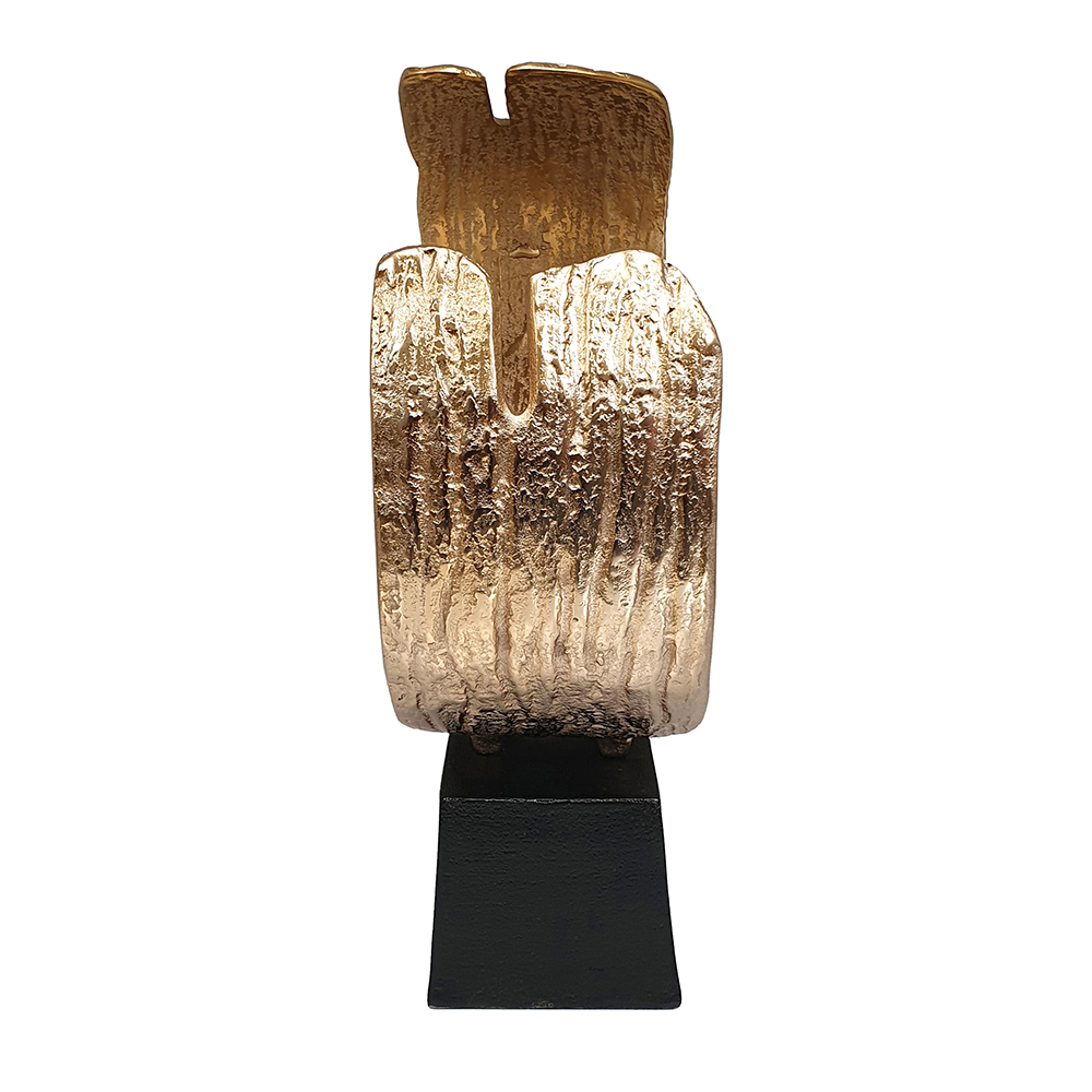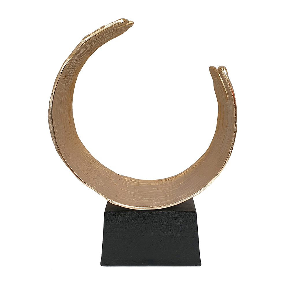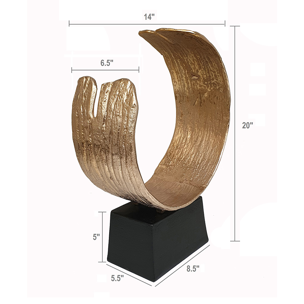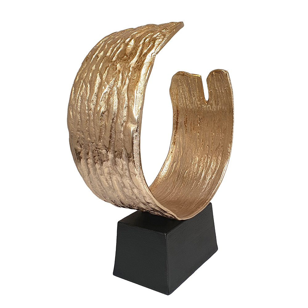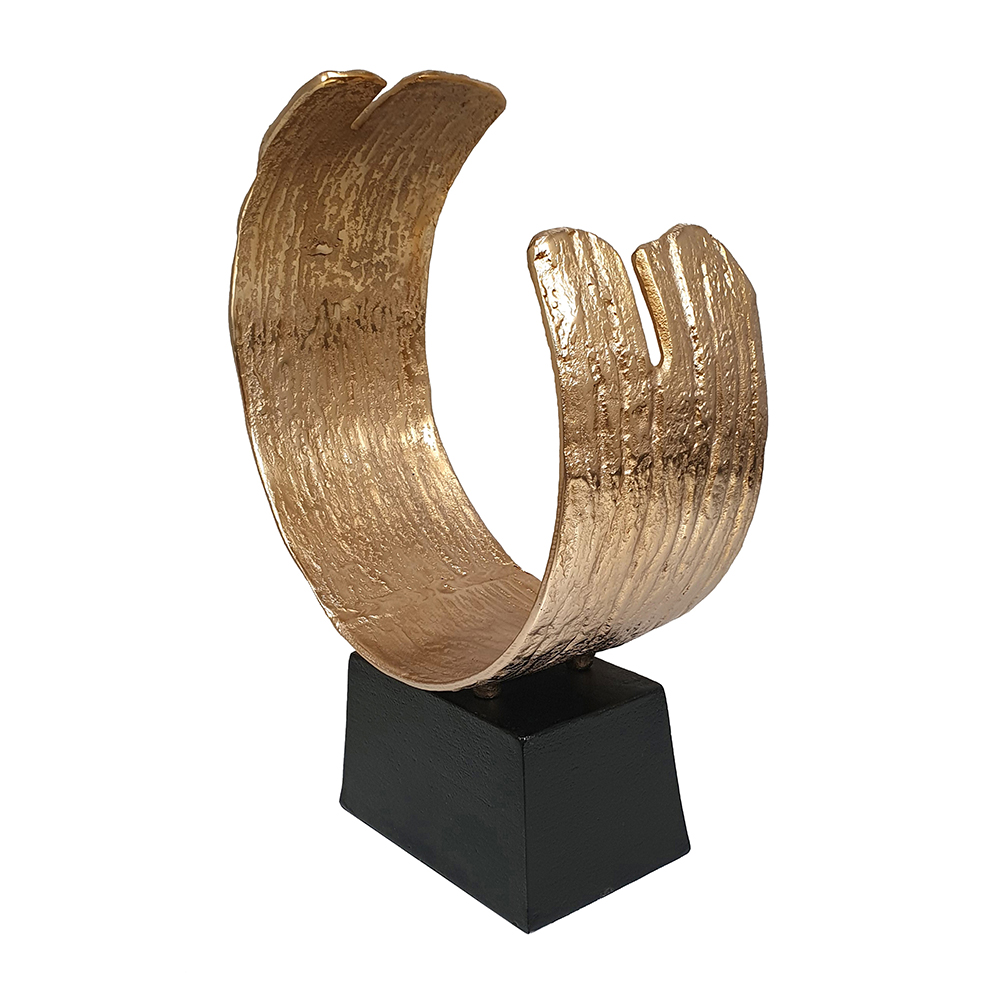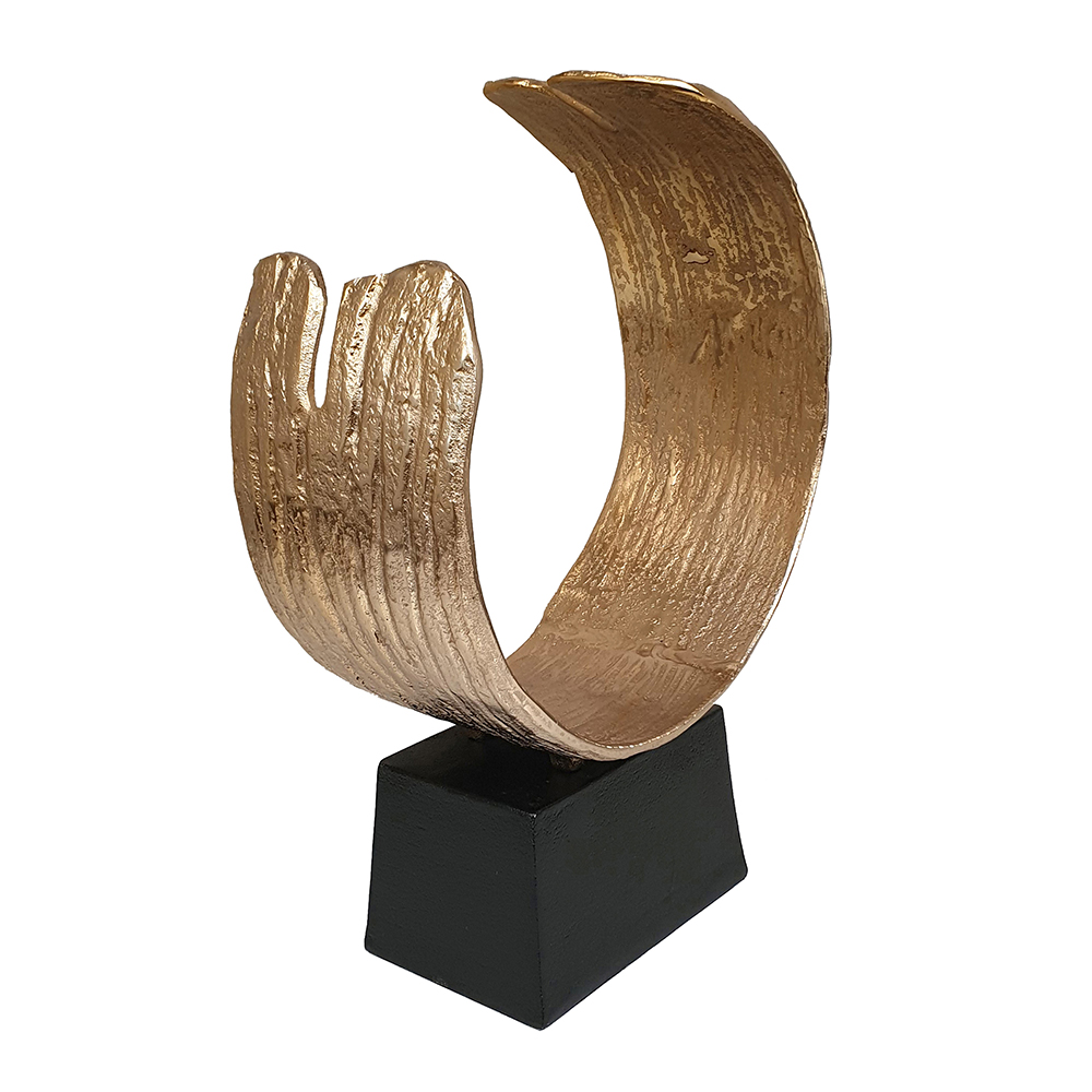 A graceful curve makes the Caruso sculpture a sophisticated addition to any room. Handcrafted in India and given a golden metallic finish to contrast the black rectangular base this piece makes a dramatic statement.