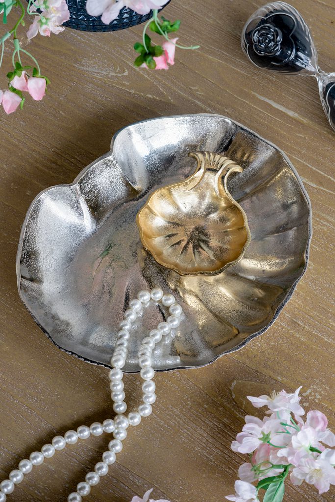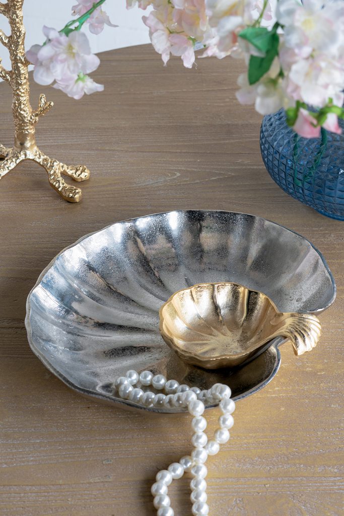 Blending modern elegance with coastal charm, this chip and dip tray features a round, scalloped design reminiscent of a seashell, finished in antique gold for a touch of refined intrigue. Perfectly sized for serving chips, vegetables, seafood, and more, it includes a built-in dip compartment to keep your favorite sauces within reach.
