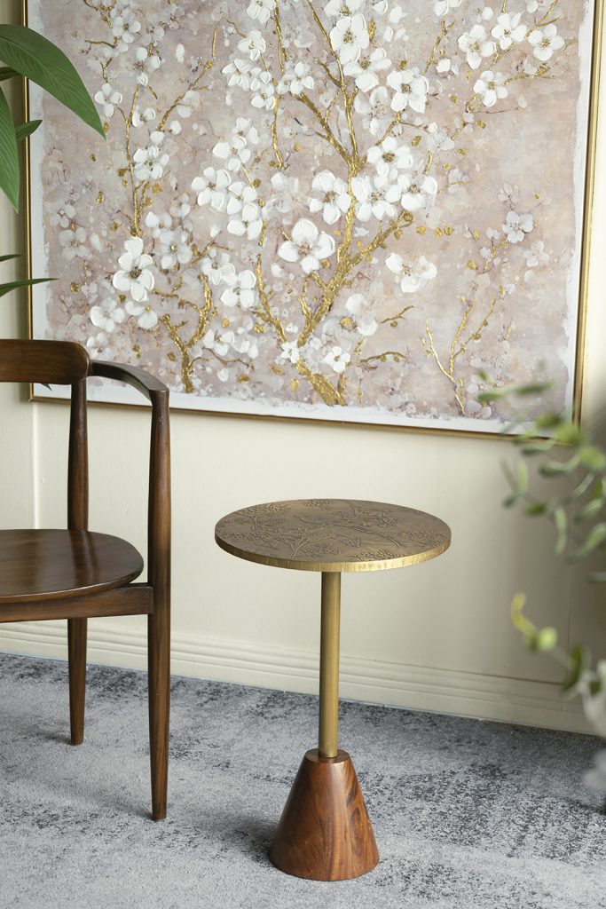 Classic design meets organic charm in this decorative side table. Featuring a round, textured gold top, a slender brass-finished frame, and a sculptural brown wood base, it elevates any space while serving as an end table, plant stand, or display pedestal.