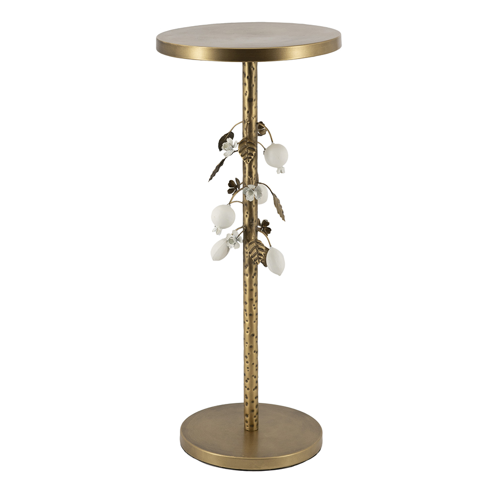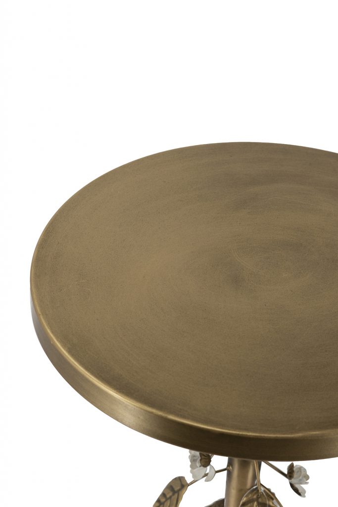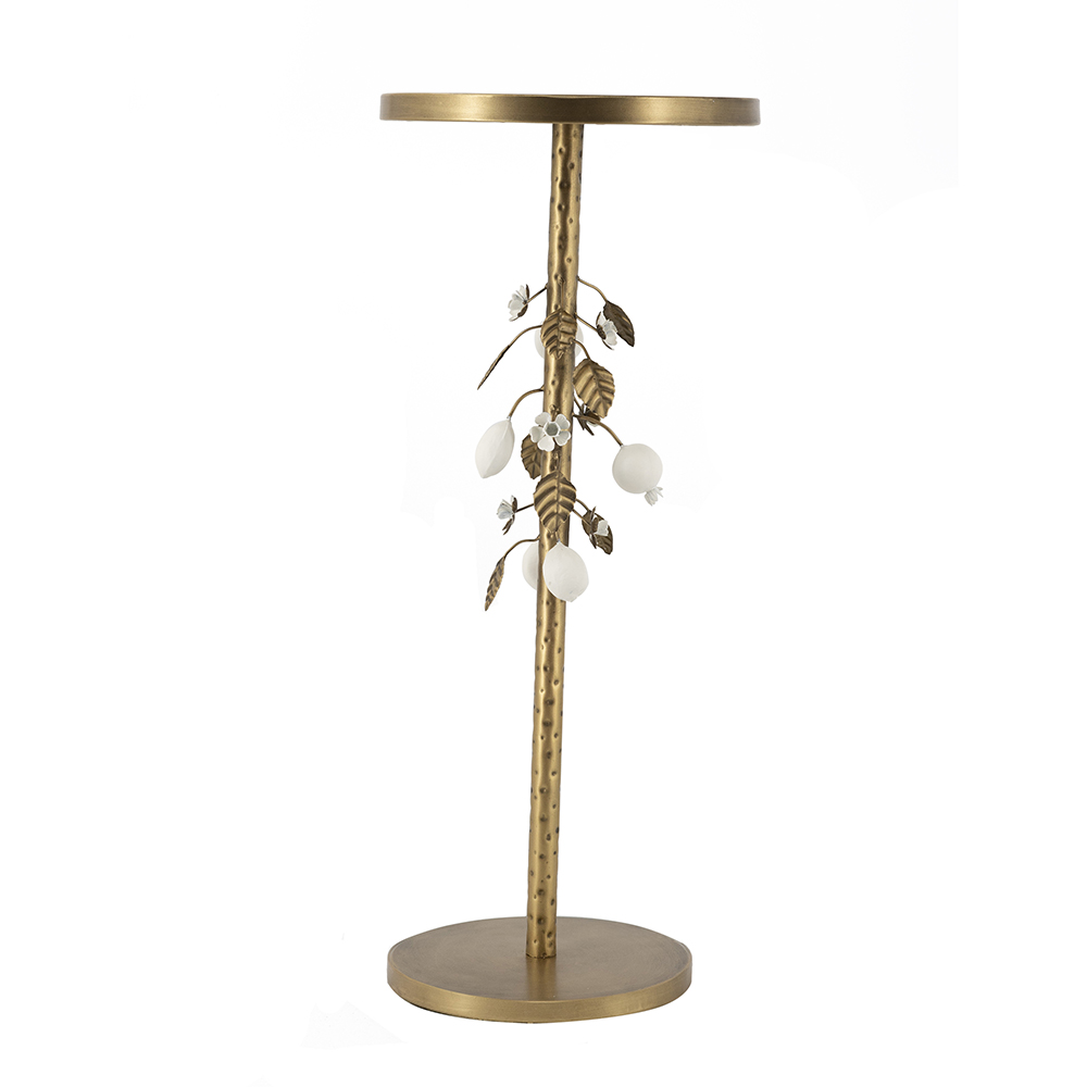 Reimagining the classic round silhouette as a luxurious home accent, this table features a sturdy circular base, a warm metallic gold finish, and intricately crafted botanical details. Perfectly sized to serve as an end table, plant stand, or display pedestal, it offers exceptional versatility while infusing any space with refined charm.