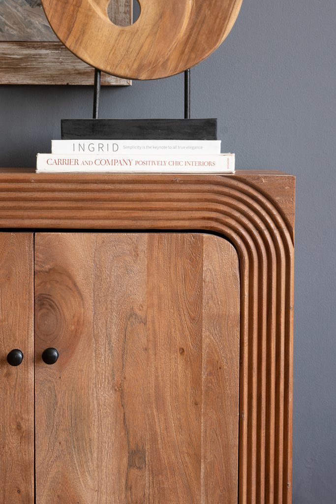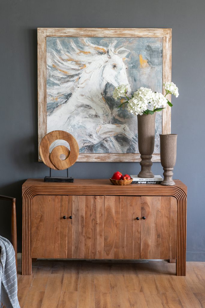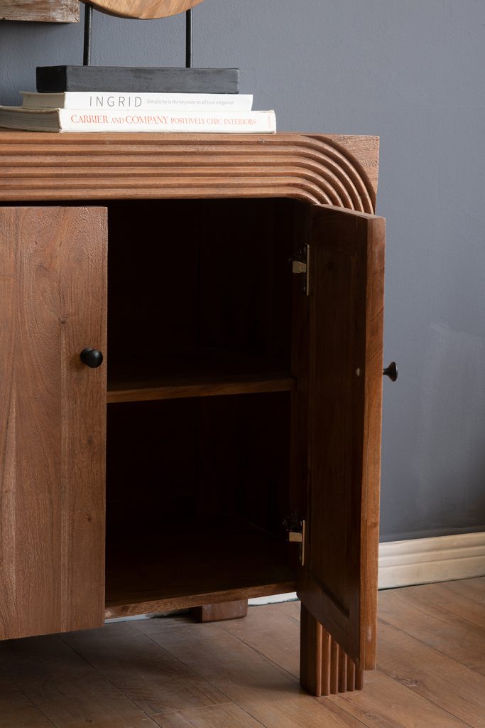 Inspired by the simple yet eye-catching designs of Scandinavia, this four-door sideboard features a rich grained brown finish, sturdy square legs, and small iron handles. Offering great versatility, it slots seamlessly into any living room, entryway, or bedroom, elevating your decor while serving as both convenient storage and a stylish display pedestal.