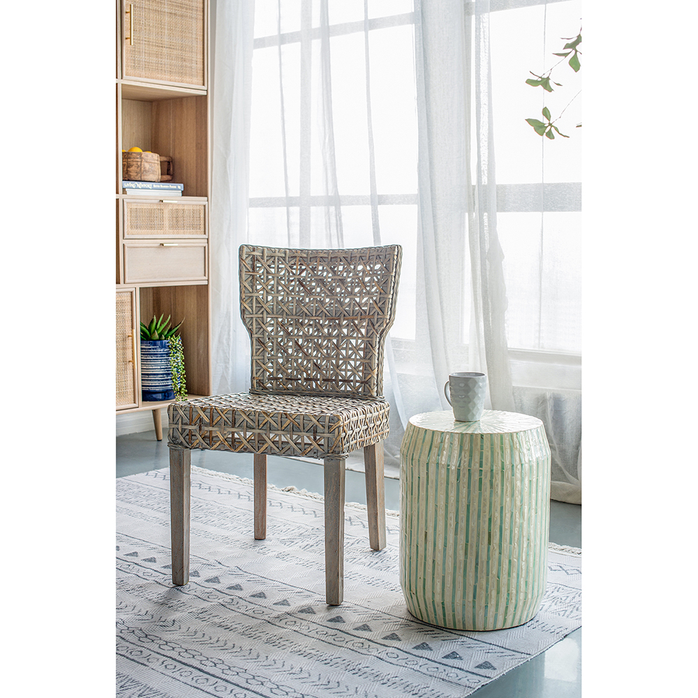 Giving a stylish modern overhaul to the classic drum design, this decorative wooden stool boasts a cylindrical frame that is embellished with a multicolored striped capiz motif. Whether it is used as a chairside end table, a creative display stand for plants and colorful accents, or as extra seating for your guests, this piece will capture the eye.
