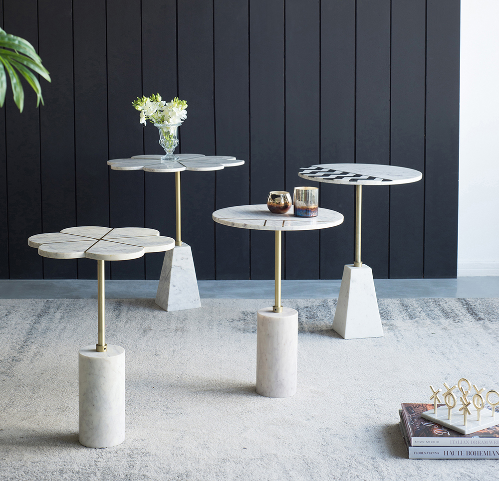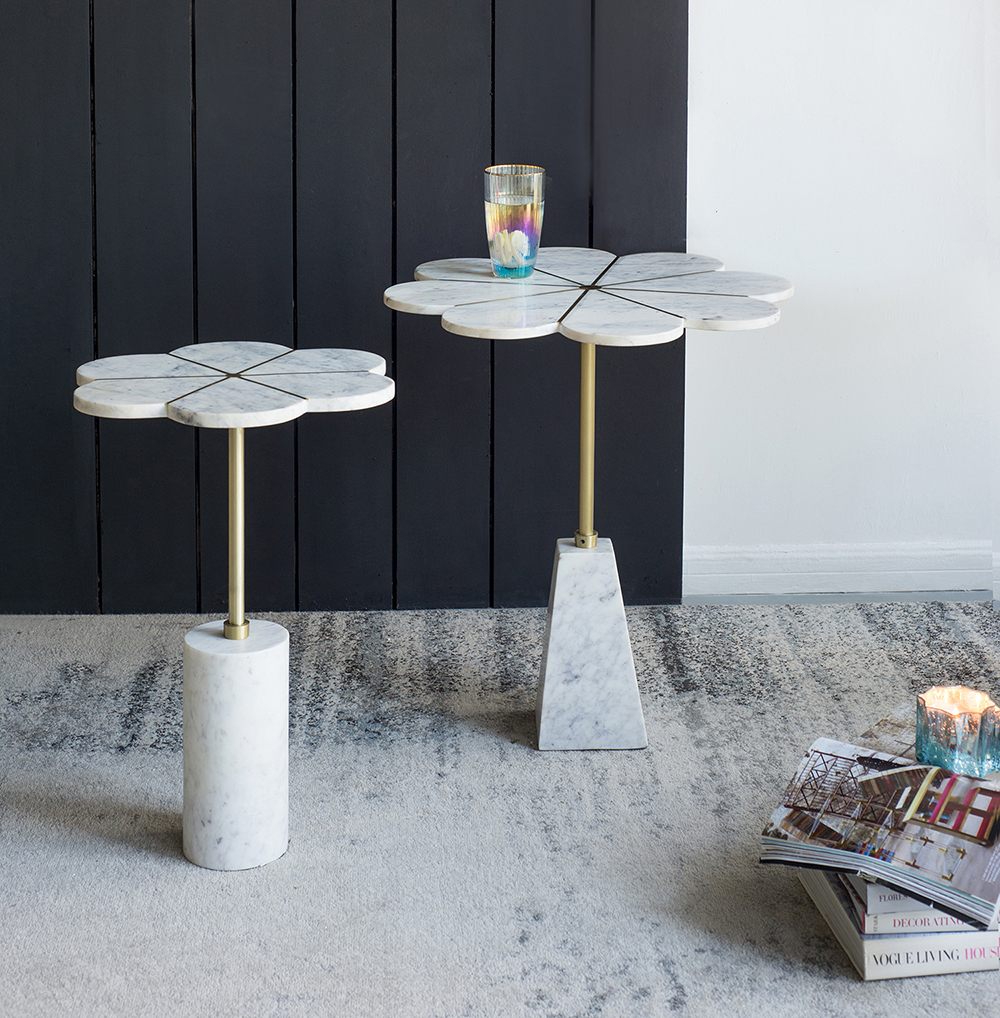 A cylindrical base made of marble is completed with a whimsical flower shaped table top. Detailed with brass inlay with brass spray, this sleek table is ideal for contemporary homes and settings. Place it in the kitchen or dining room to complement decor and show off your favorite mementos.