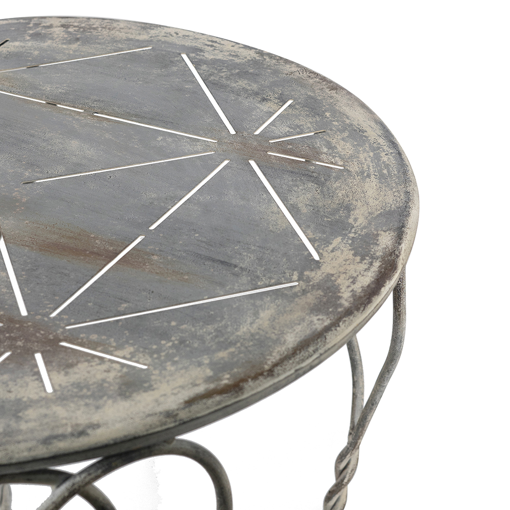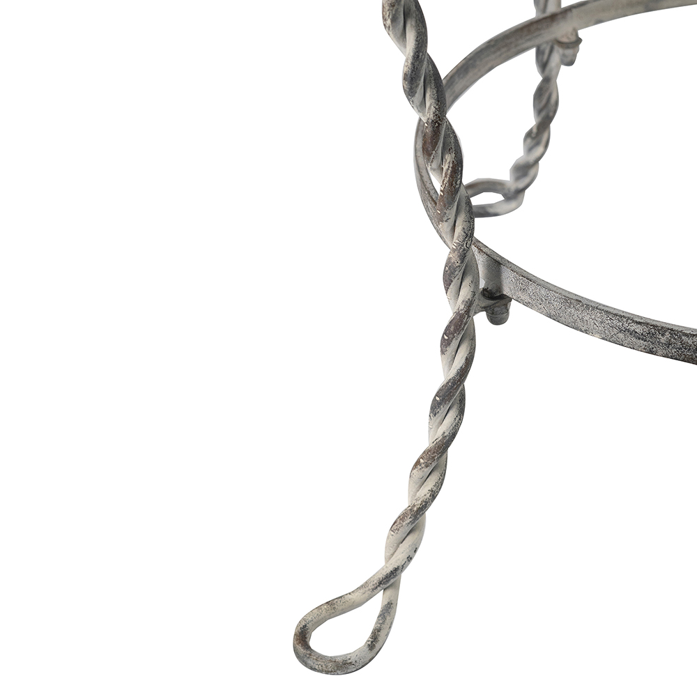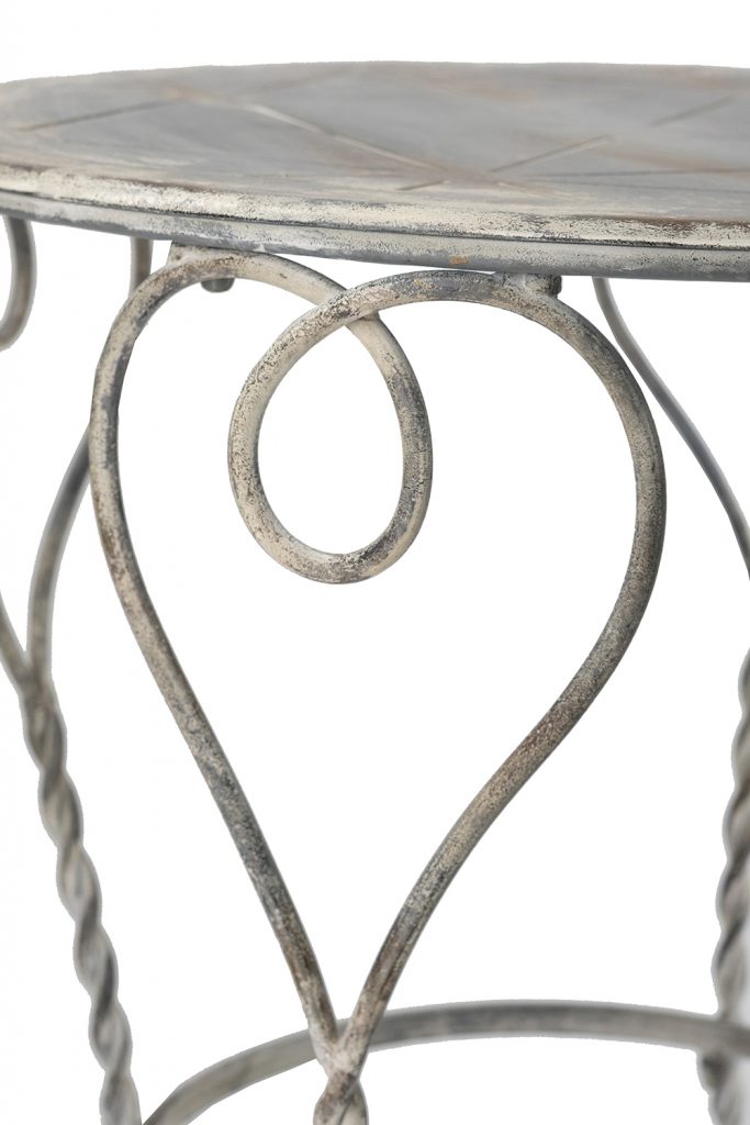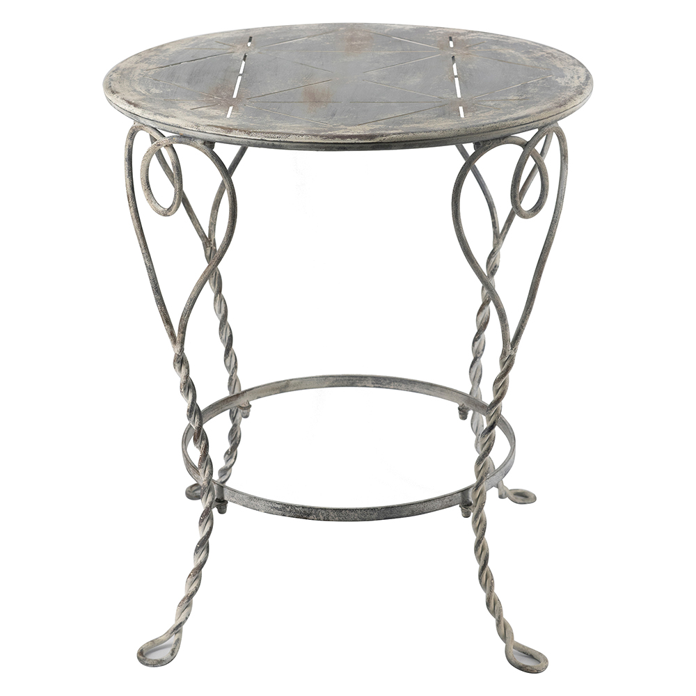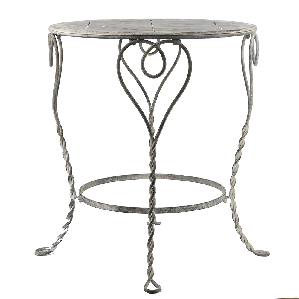 Add romantic flair to your space with this charming iron side table. Crafted from sturdy iron with a distressed silver finish, it features elegant heart-shaped swirls and twisted legs for a vintage, shabby chic vibe. The round top and lower ring shelf offer display space for lamps, plants, or books. Perfect for bedrooms, living rooms, or patios. Durable and easy to assemble for timeless appeal.