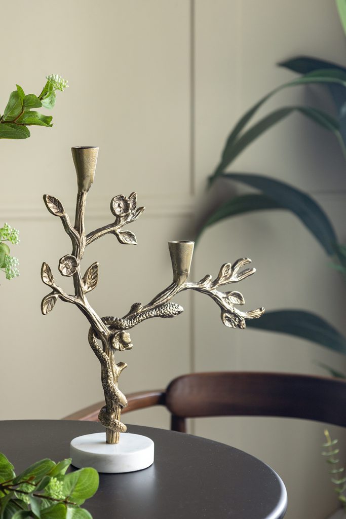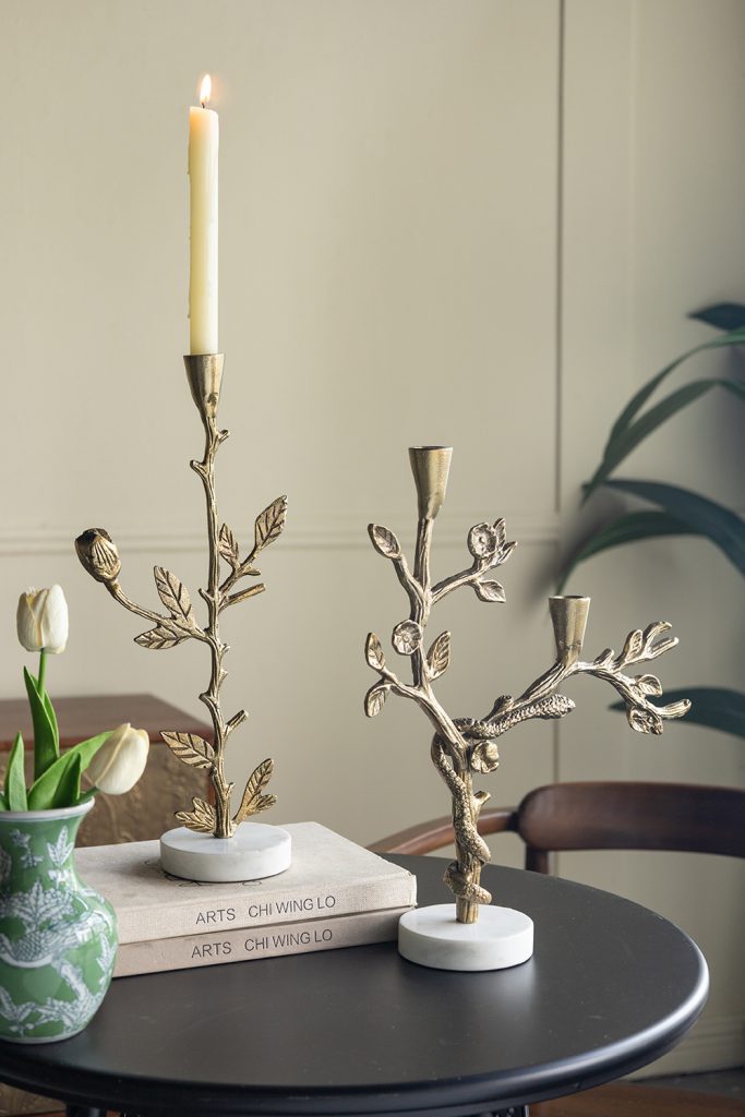 Drawing inspiration from the effortless yet intricate beauty of nature, this candle holder features a twisting branch silhouette, detailed leaf accents, and a genuine white marble base. Finished in rich gold, it will elevate your home decor while spreading a soothing glow when paired with one or two taper candles.