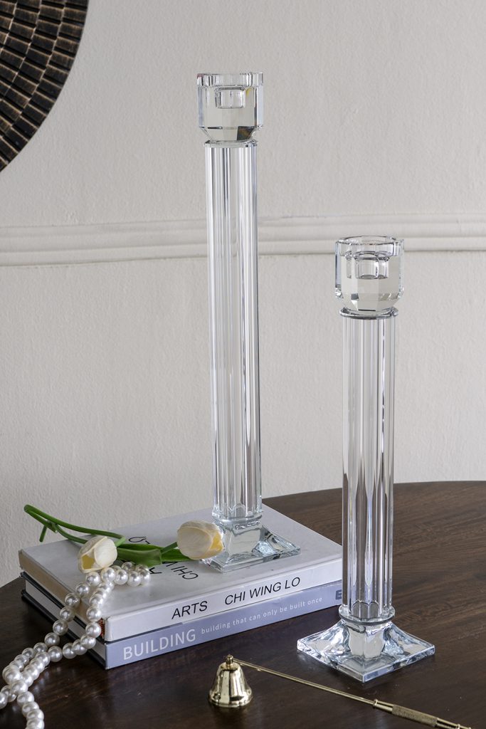 Drawing inspiration from Roman architecture, this candle holder features a slender, elongated column design, a round cup, and a beveled pedestal base. Finished in an elegant clear hue, it is sure to capture the eye whether displayed alone, added to a bold ensemble, or paired with a taper candle.