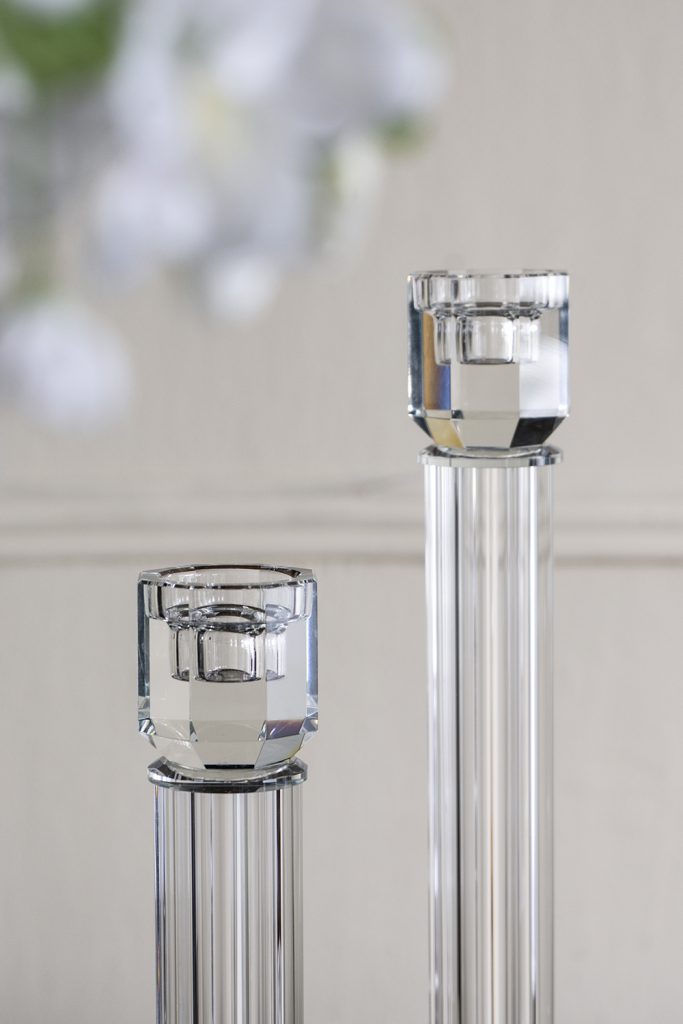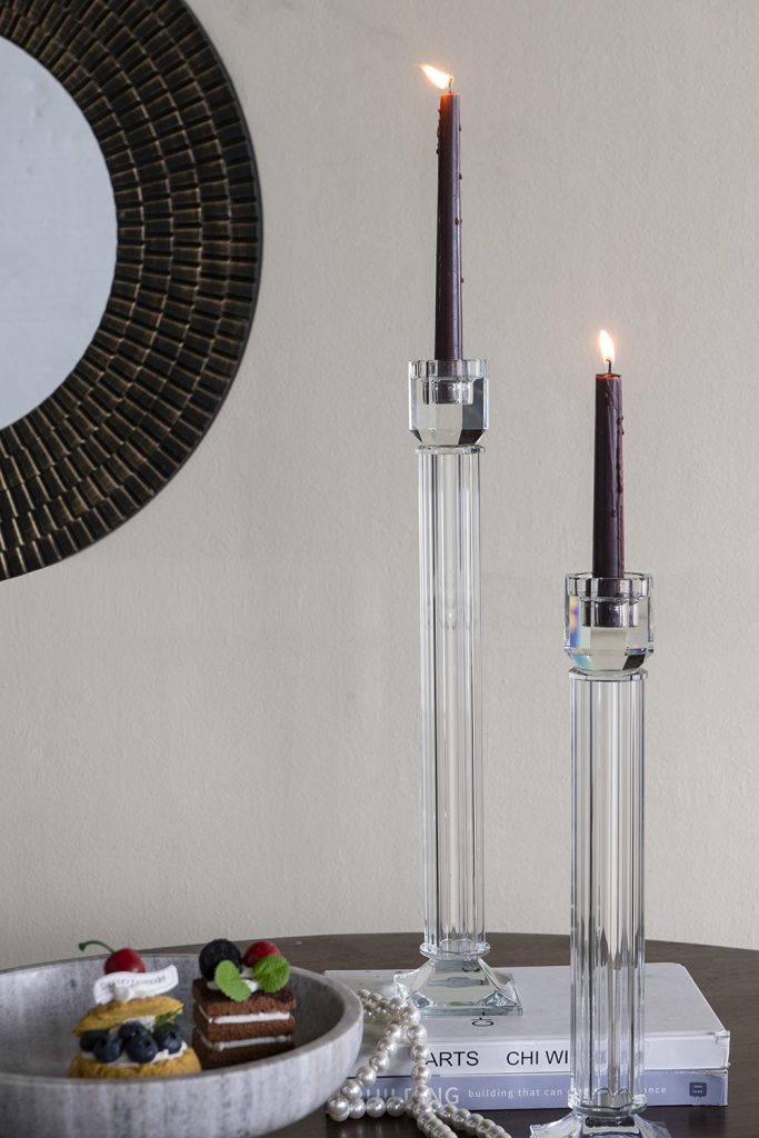 Drawing inspiration from Roman architecture, this candle holder features a slender, elongated column design, a round cup, and a beveled pedestal base. Finished in an elegant clear hue, it is sure to capture the eye whether displayed alone, added to a bold ensemble, or paired with a taper candle.