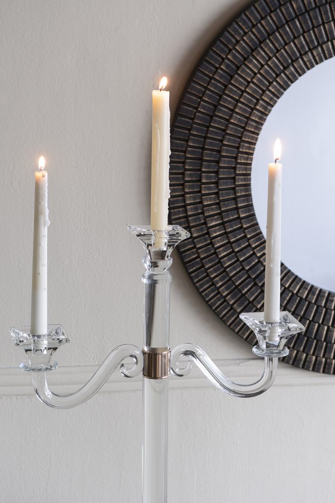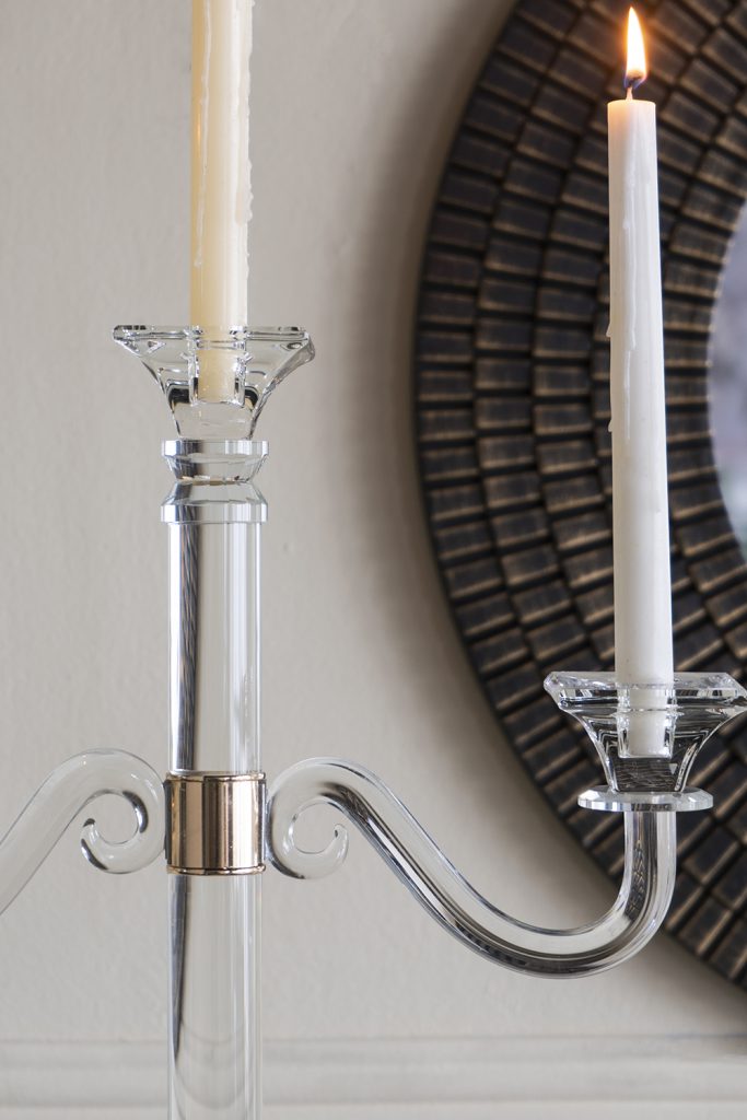 Bridging the gap between classic design and modern artistry, this candelabra features a traditional silhouette with a sleek clear finish, a luxurious metallic gold band, and two gracefully curved arms. Perfectly sized for any tabletop, dresser, or sideboard, it captures the eye whether displayed on its own or paired with up to three taper candles.