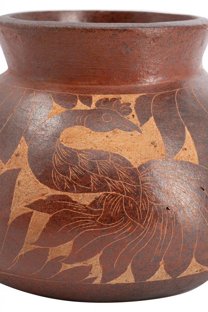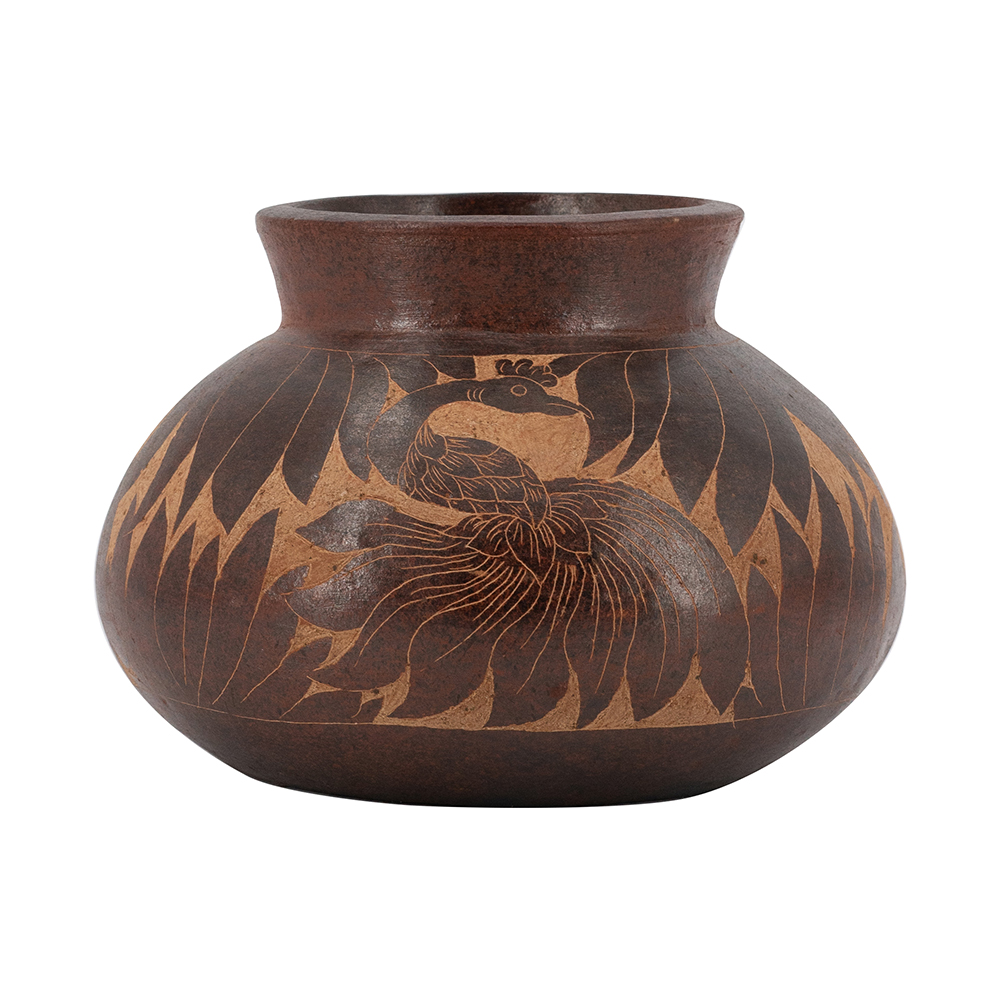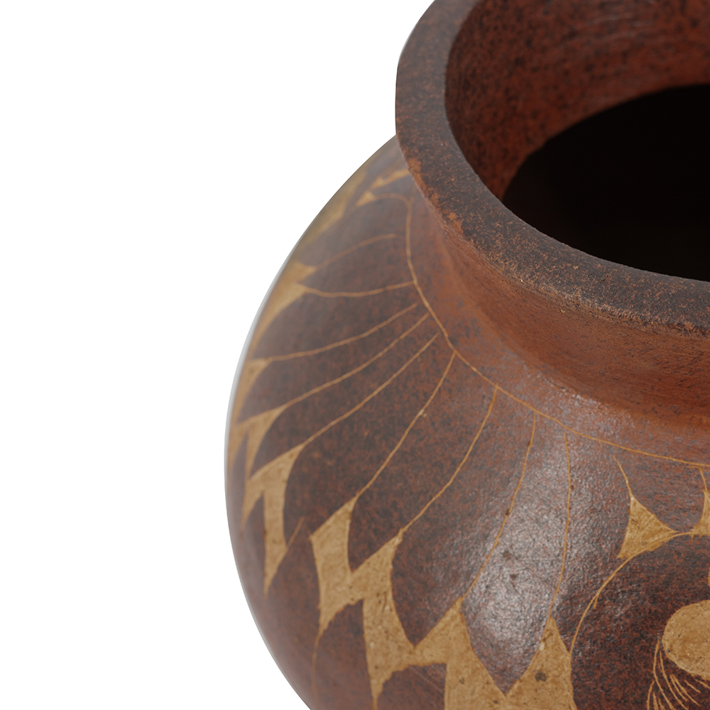 Bring exotic rustic warmth to your decor with this handcrafted terracotta vase, etched with a majestic peacock design featuring intricate feathers and foliage for artistic allure. Earthy brown hues and textured clay finish offer organic elegance, suitable for displaying stems, branches, or as a standalone piece. Squat, rounded shape with narrow neck fits bohemian or farmhouse aesthetics.