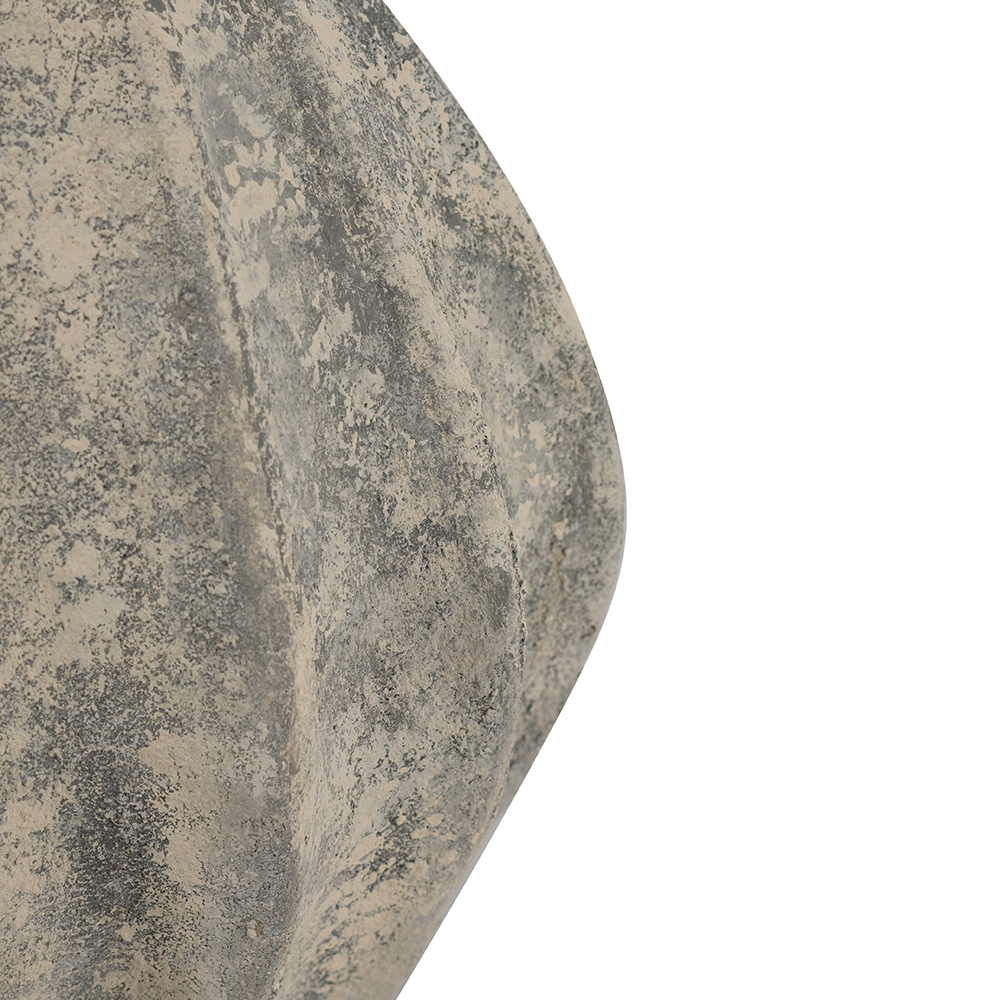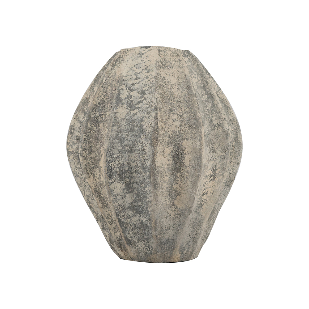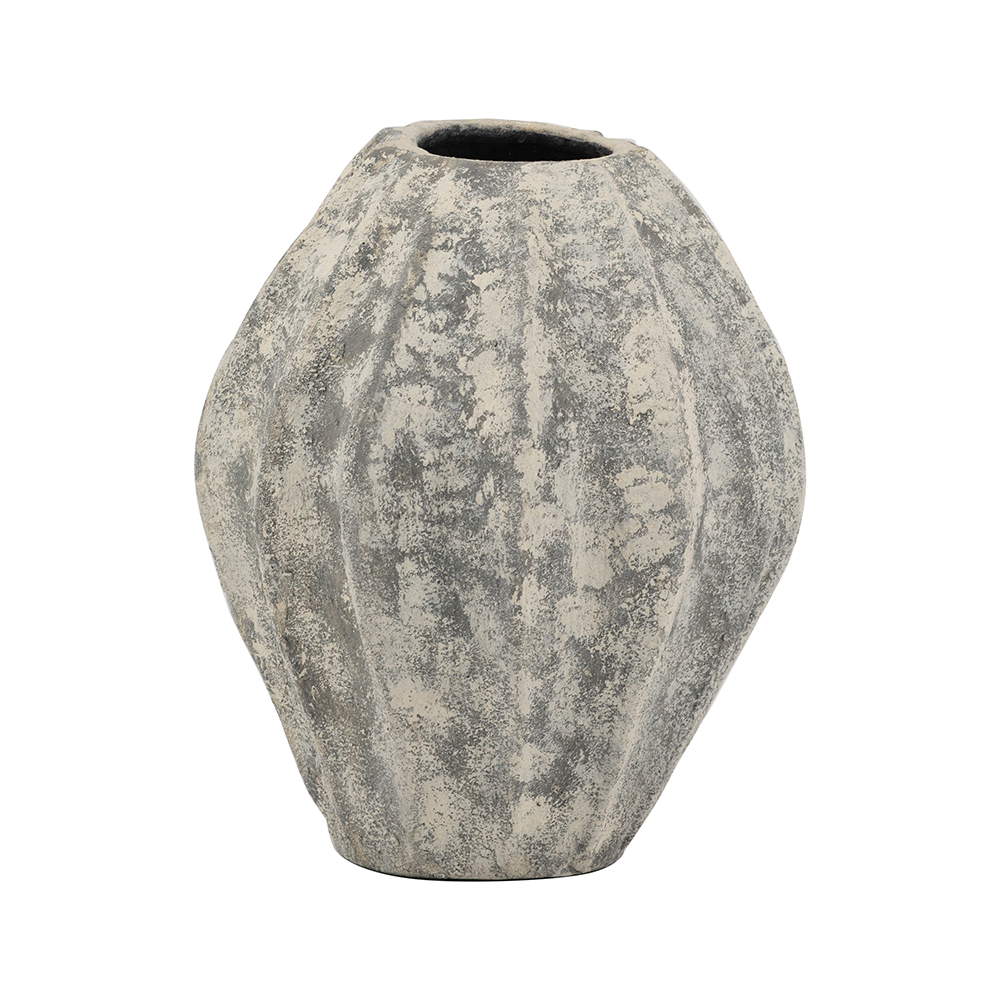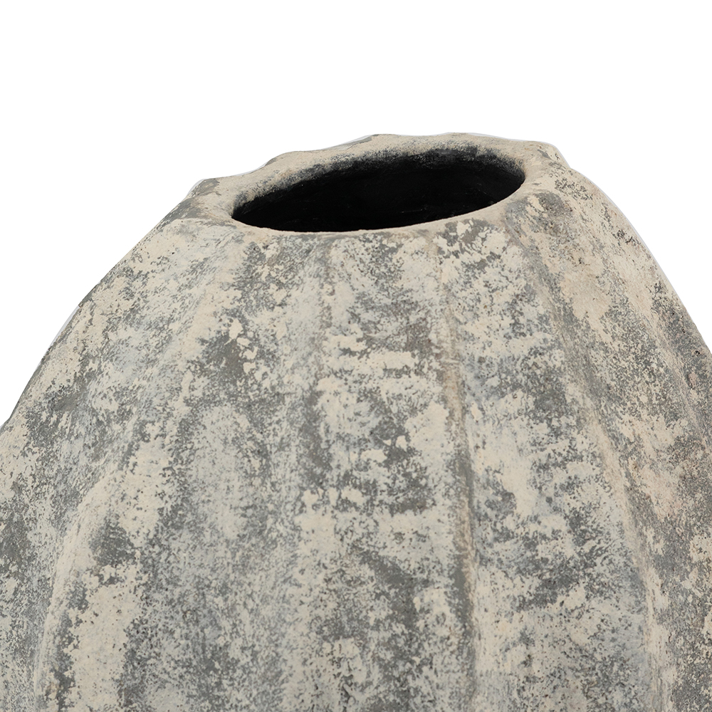 Add timeless rustic elegance to your space with this handcrafted terracotta vase, featuring vertical fluting and a mottled gray-beige distressed finish that mimics weathered stone for organic appeal. Its tapered, bulbous form with flared neck creates a vintage silhouette, perfect for flowers, stems, or as an accent piece. Neutral tones suit bohemian, farmhouse, or minimalist styles.